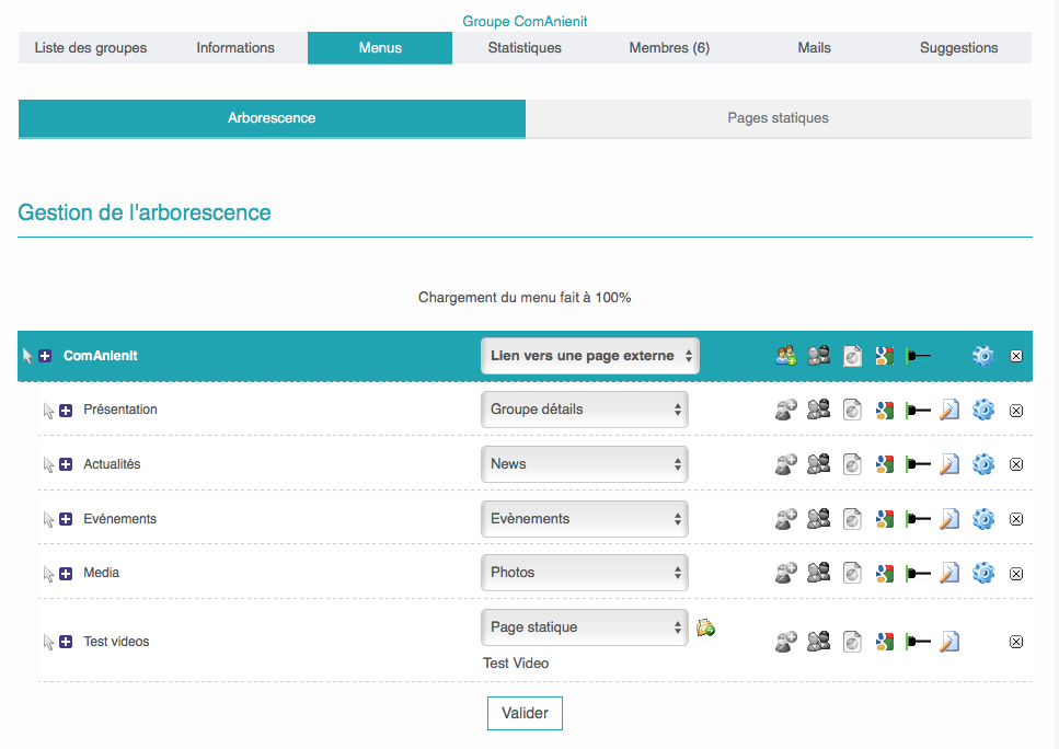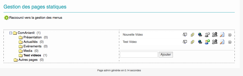 Vérifier que dans "Gestion de l'Arborescence" que le fichier est bien indiqué ( ligne Test Vidéos , sous "Page Statique" )
