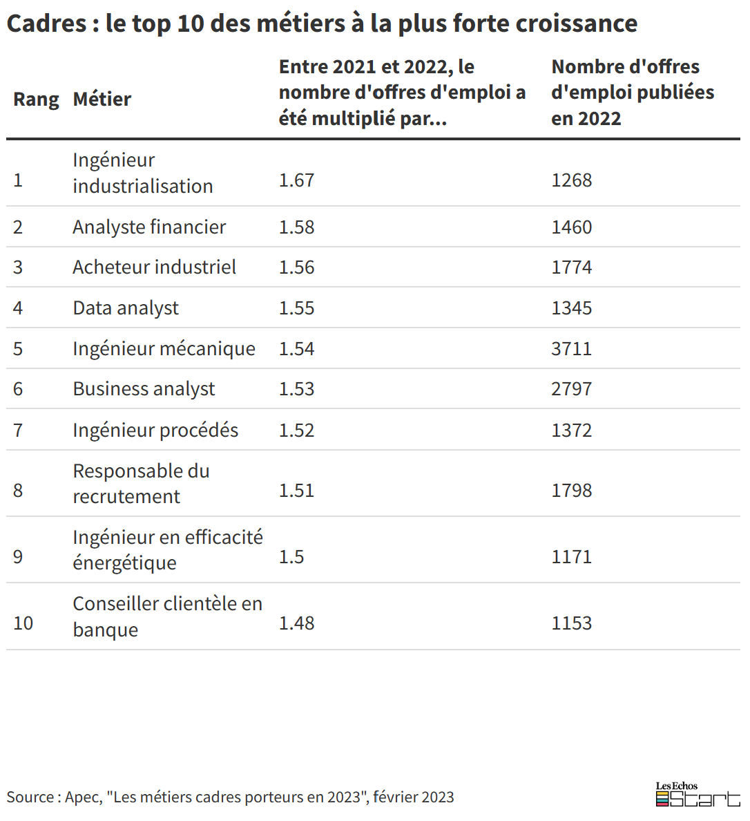 L'Apec s'est également penchée sur les métiers à la plus forte croissance. Pour ce faire, elle s'est intéressée uniquement à ceux dont le nombre d'offres d'emploi publiées en 2022 est supérieur ou égal à 1.000, pour ne pas s'attarder sur des professions qui seraient encore trop « niche ». Résultat : ce sont les ingénieurs industrialisation - chargés de l'industrialisation de nouveaux produits au sein d'une unité industrielle - qui ont connu le plus fort essor, avec un nombre d'offres d'emploi multiplié par 1,67 entre 2021 et 2022.