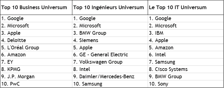**Méthodologie de l'étude Universum: Enquête menée à travers 10 pays (USA, Chine, Japon, Allemagne, Royaume-Uni, France, Inde, Italie, Brésil, Russie, Canada et Corée du Sud) entre septembre 2020 et mai 2021, auprès de 221.807 étudiants: 110.529 en écoles de commerce, 84.476 en écoles d’ingénieurs et 26.802 en IT. Pour faire partie des classements WMAE, les entreprises doivent être présentes dans les classements Universum d’au moins 5 des pays.