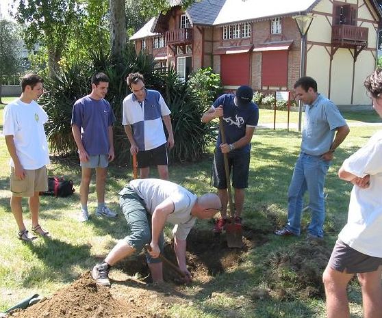 Nous avons choisi la 2ème solution en nous équipant d’une mini-pelle et quelques coups de pelles plus tard, le cercueil intact refaisait surface. Nous avons pris plaisir à retrouver des photos, nos plaquettes, quelques objets personnels, des revues de «femmes dénu-dées »…..et bien évidemment un cubi et de merveilleux millésimes (ou pas) que nous avons dégustés pour nous hydrater après tant d’efforts ! Il ne res-tait plus qu’à reboucher le trou et planter quelques fleurs pour remettre en état le jardin, sans oublier d’y laisser un souvenir de notre venue ! Après le voyage du retour en bus (qui fût fatal pour 2-3 membres de la promo….), nous avons re-pris des forces au gîte autour d’un bon repas, la soirée se prolongea tard, très tard….pour dégustater* nos chers millé-simes, mais aussi quelques potions plus récentes !