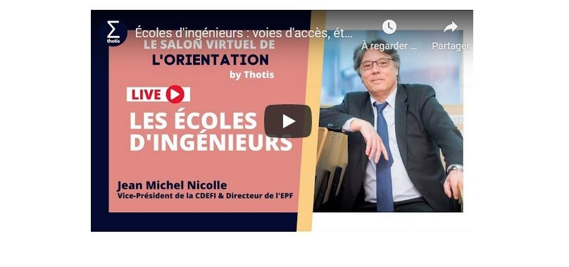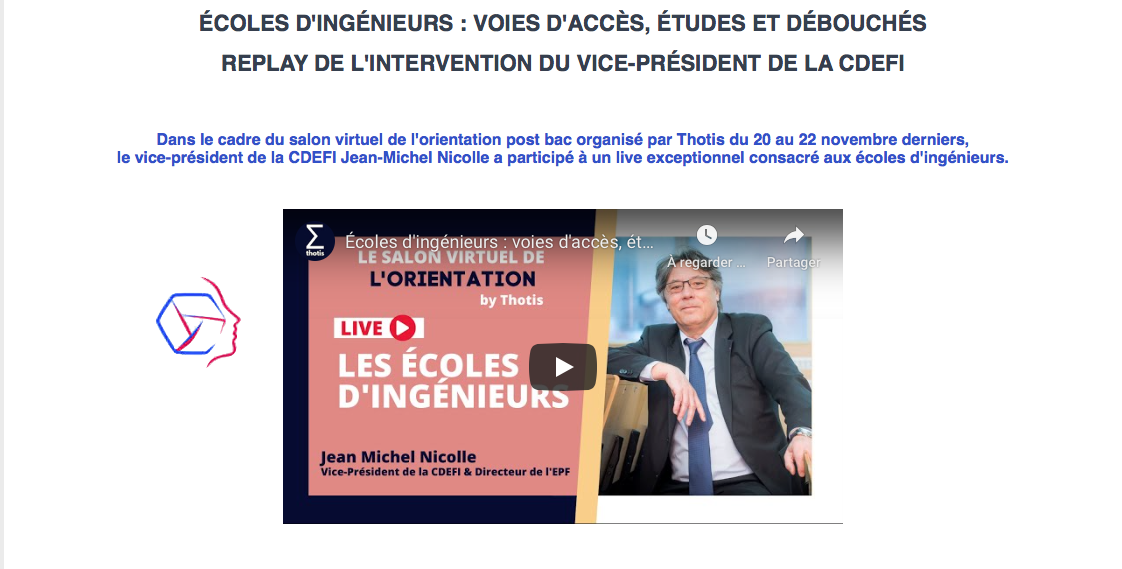 Dans le cadre du salon virtuel de l'orientation post bac organisé par Thotis les 20, 21 et 22 novembre derniers, le vice-président de la CDEFI Jean-Michel Nicolle a participé à une émission exceptionnelle en direct consacrée aux écoles d'ingénieurs.