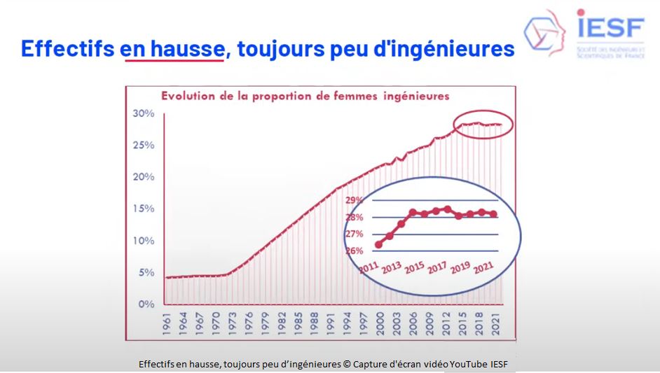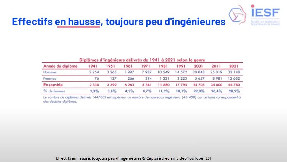 « En 2021, sur plus de 44 000 diplômés, les femmes représentaient 28%. L’image de profession est trop masculinisée », explique Marie-Liesse Bizard, Vice-Président de l'IESF. Les jeunes femmes sont sous représentées dans les écoles d'ingénieurs. Parmi les étudiantes interrogées, 47% ont fait ce choix d’orientation à partir d’une décision personnelle alors que, 30% ont affirmé que cette décision venait de leurs parents.