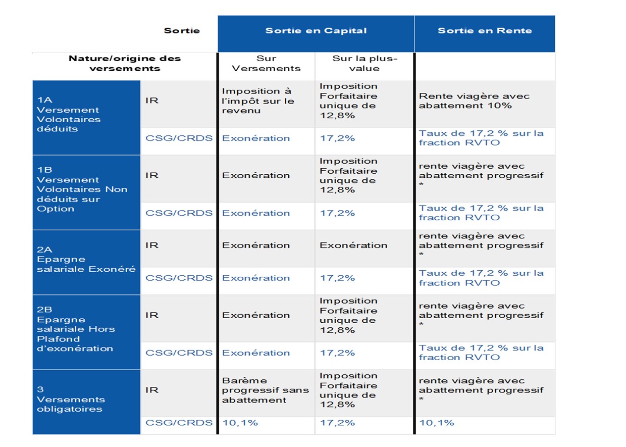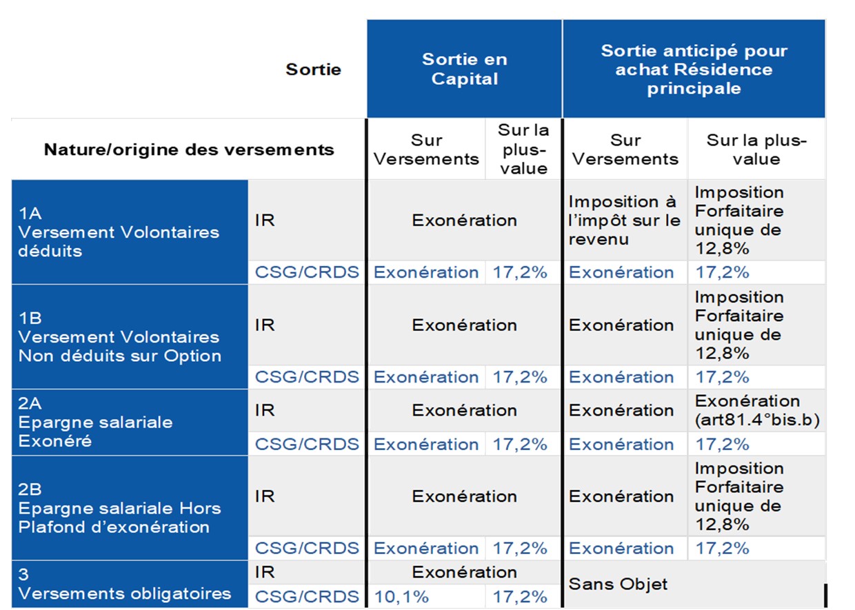 En cas de sortie pour cause d’acquisition de la résidence principale, seuls les versements déductibles dans un PER individuel subiraient la fiscalité sur ces mêmes versements ainsi que sur le plus-values éventuelles.