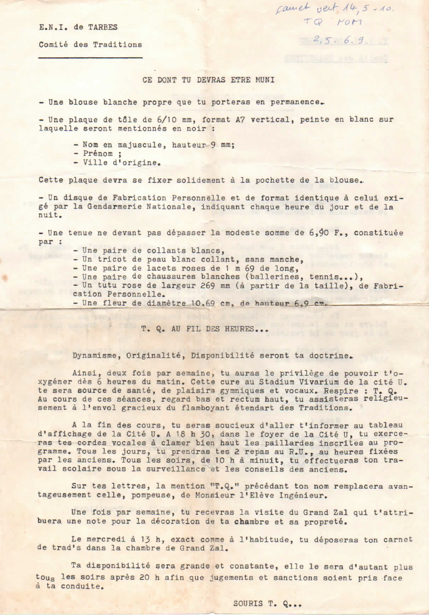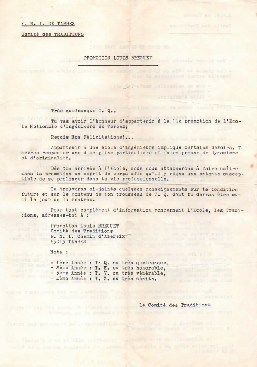 Le jeune Ingénieur dit affectueusement TQ recevait avant son arrivée à l'ENIT un lettre pleine de tendresse, lettre envoyée par les Trad's.
