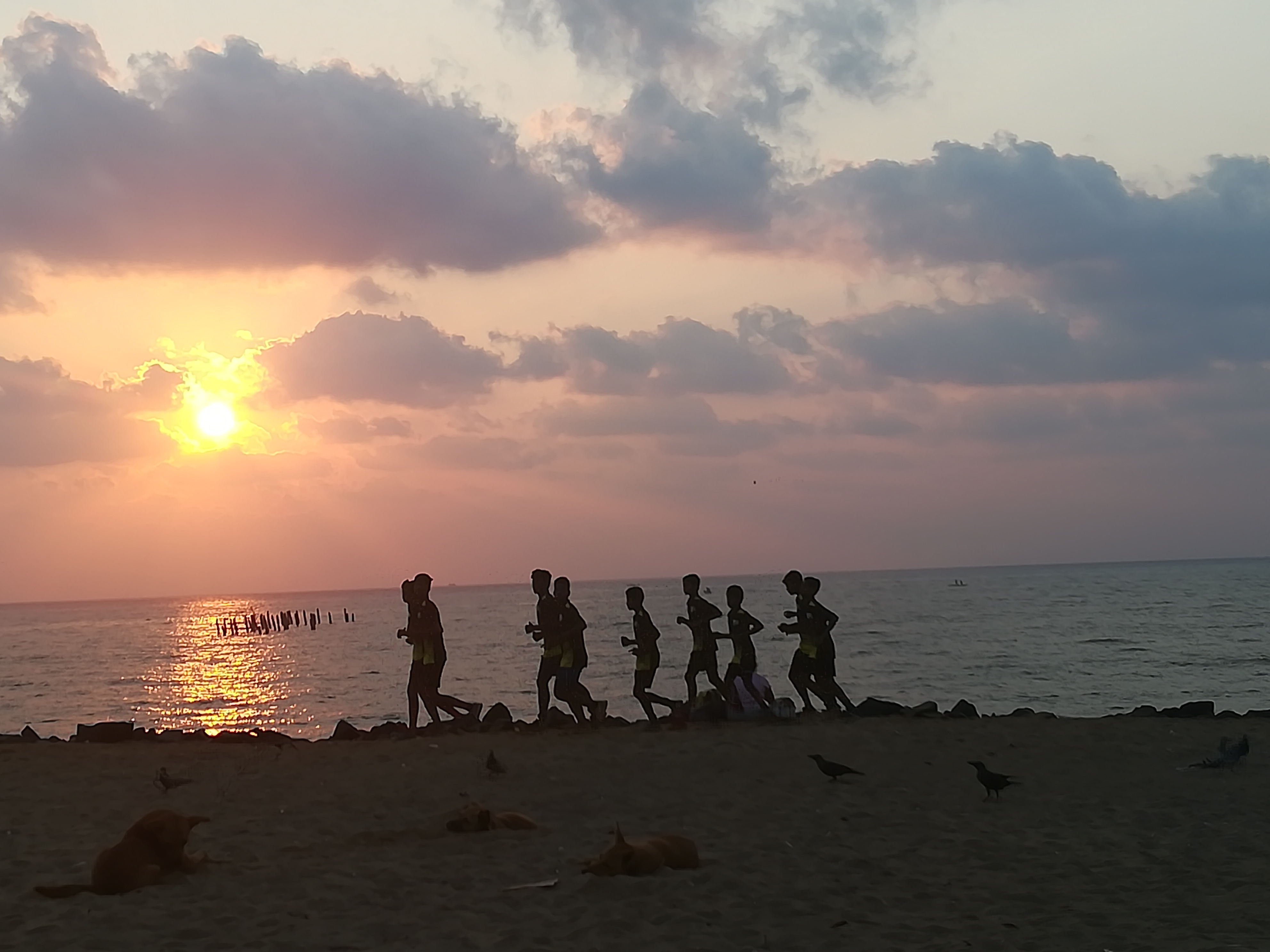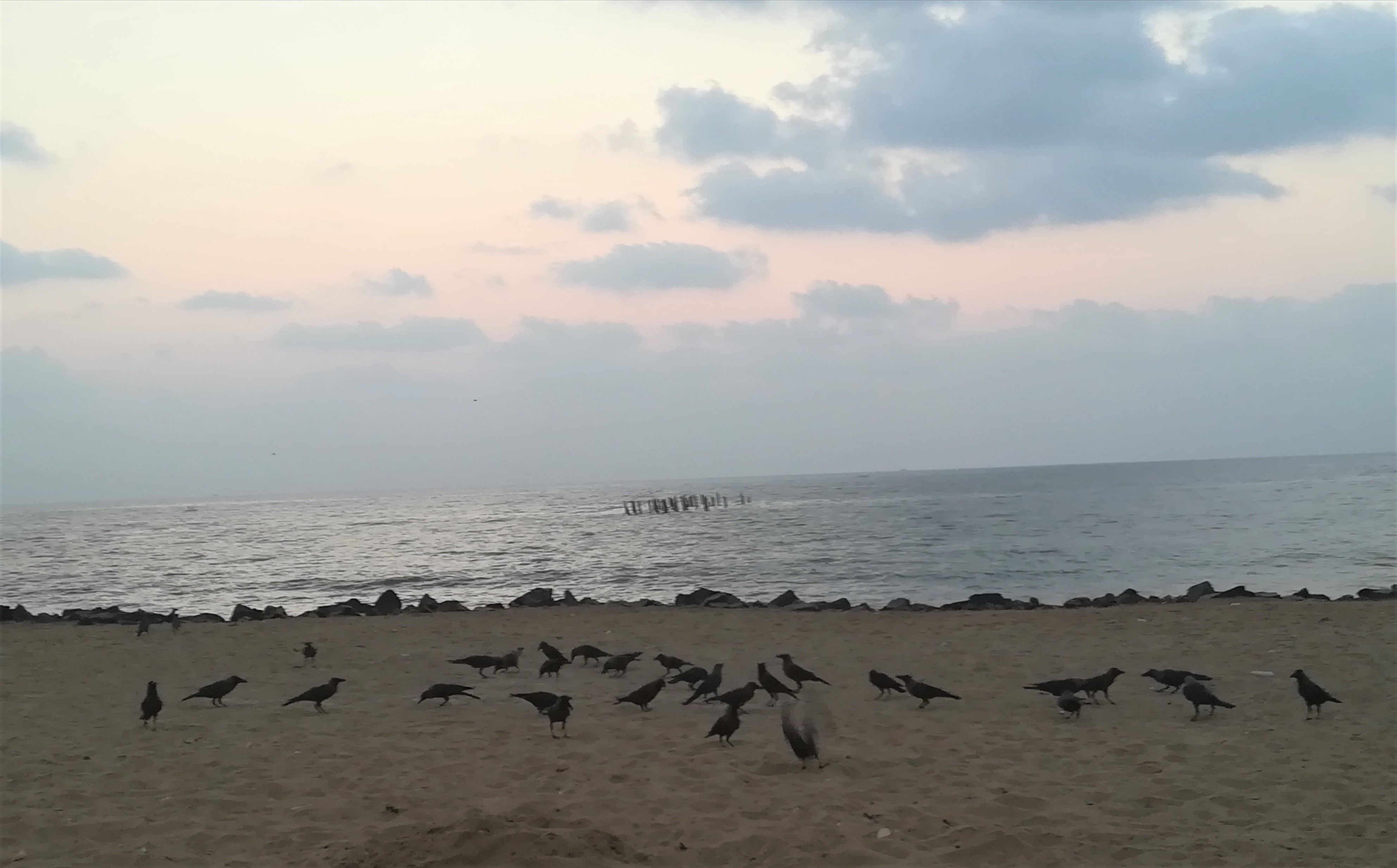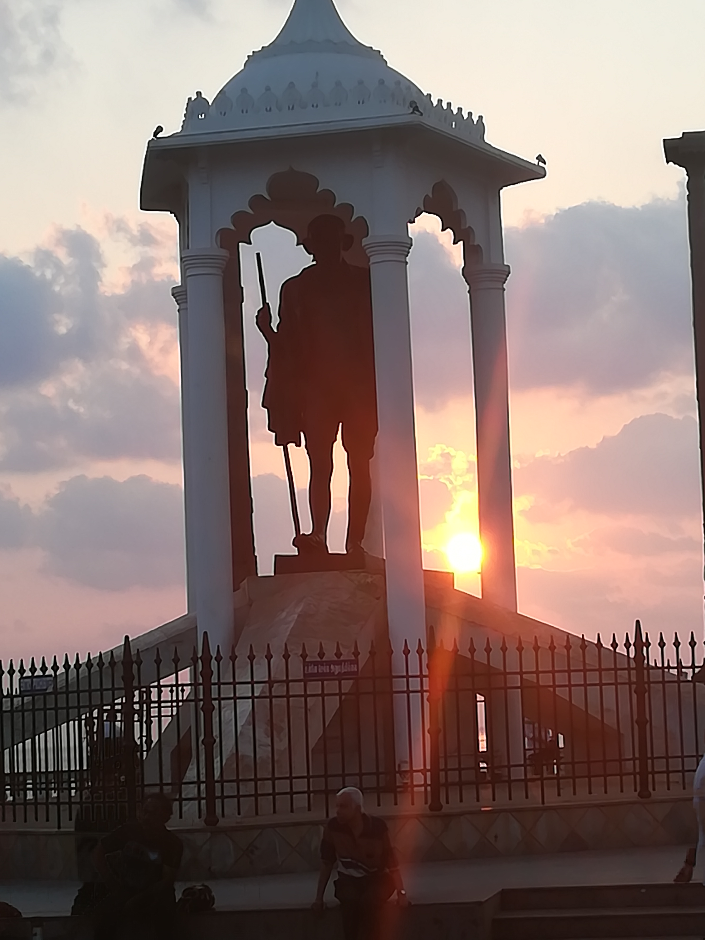 Les croassements des corneilles viennent interrompre mon sommeil aux premières lueurs du jour. On m'a dit que le lever de soleil est magnifique ici sur la baie. J’y vais. En ce matin, une centaine d'enfants et adolescents, de noir et vert vêtus, est installée sur l'esplanade en bord de mer pour un yoga collectif. Le bonheur en Inde n'est pas dans le pré mais dans le Yoga et la méditation. Et puis, le soleil apparaît haut dans le ciel derrière l'effigie de Gandhi, j’ai vu mieux. Quelques sportifs courent sur la bande de sable derrière les rochers pare-vagues de la digue. Les corneilles sont là aussi. Le jour est bien levé maintenant, il est temps de prendre le bus pour Madras.