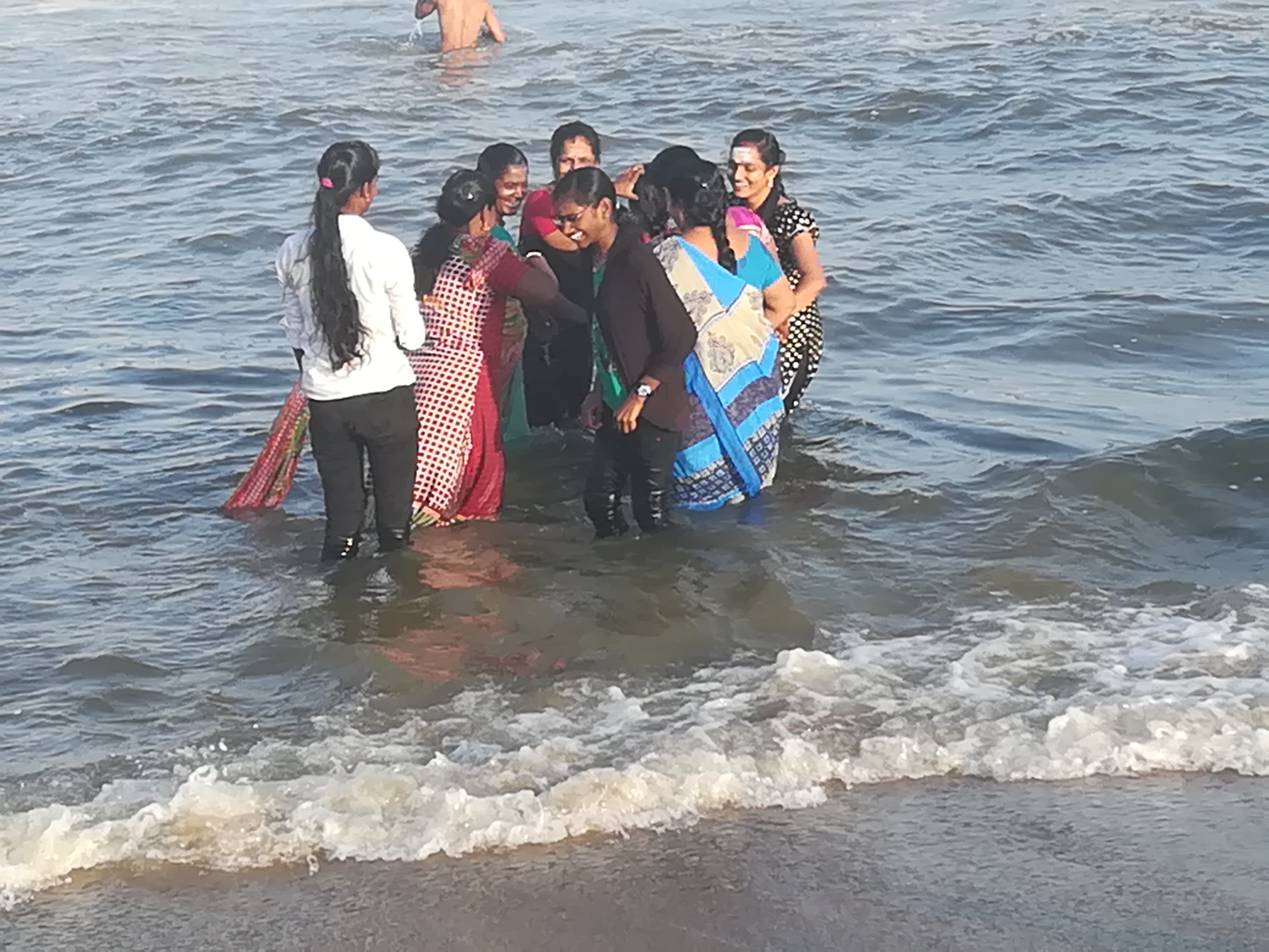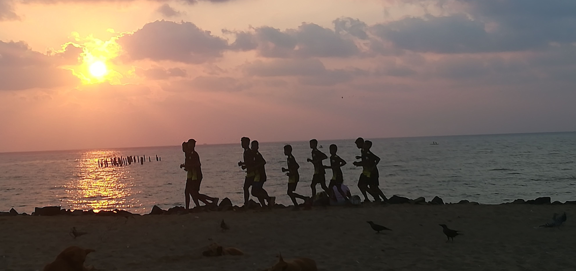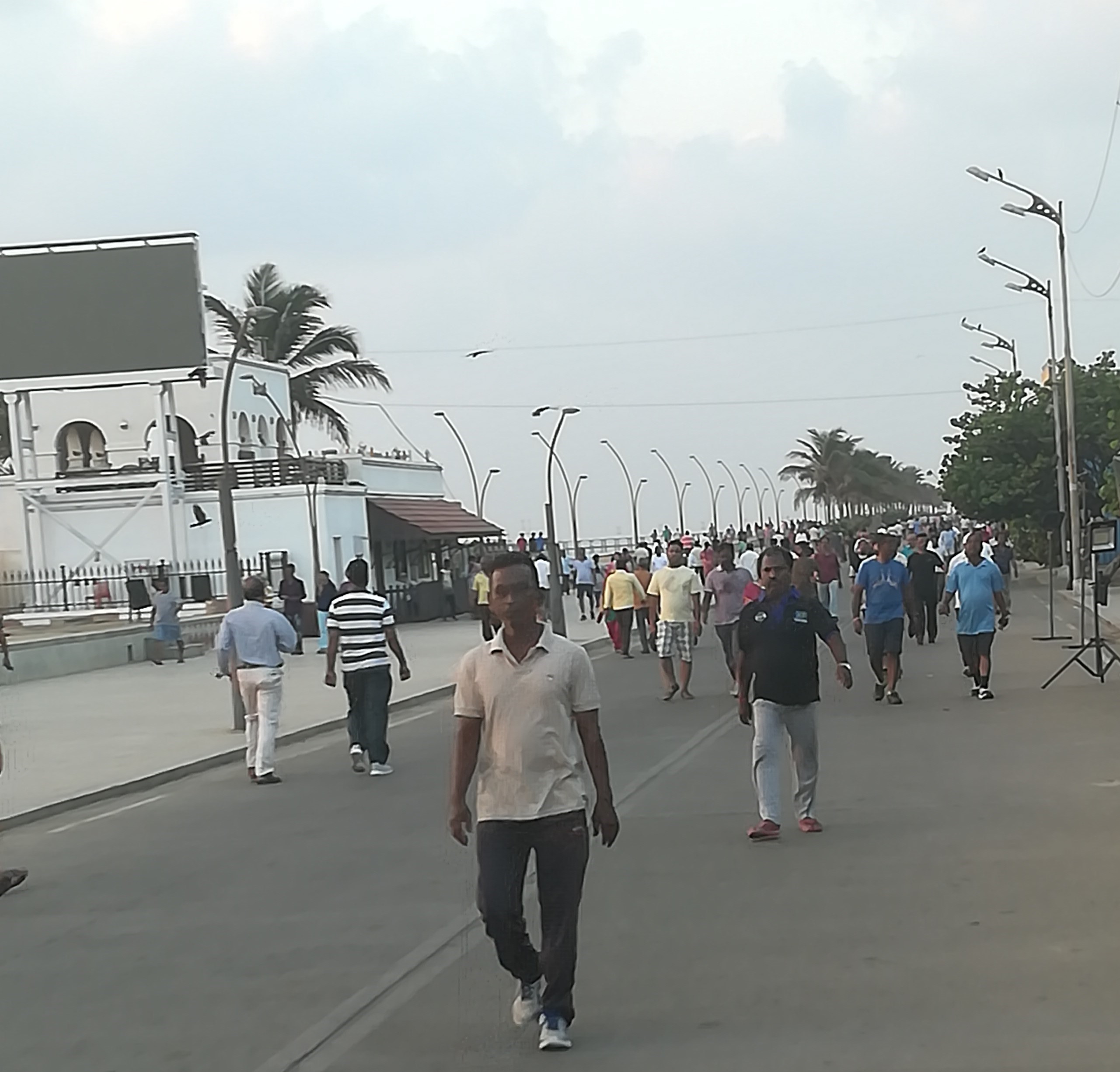 Les croassements des corneilles viennent interrompre mon sommeil aux premières lueurs du jour. On m'a dit que le lever de soleil est magnifique ici sur la baie. J’y vais. En ce matin, une centaine d'enfants et adolescents, de noir et vert vêtus, est installée sur l'esplanade en bord de mer pour un yoga collectif. Le bonheur en Inde n'est pas dans le pré mais dans le Yoga et la méditation. Et puis, le soleil apparaît haut dans le ciel derrière l'effigie de Gandhi, j’ai vu mieux. Quelques sportifs courent sur la bande de sable derrière les rochers pare-vagues de la digue. Les corneilles sont là aussi. Le jour est bien levé maintenant, il est temps de prendre le bus pour Madras.