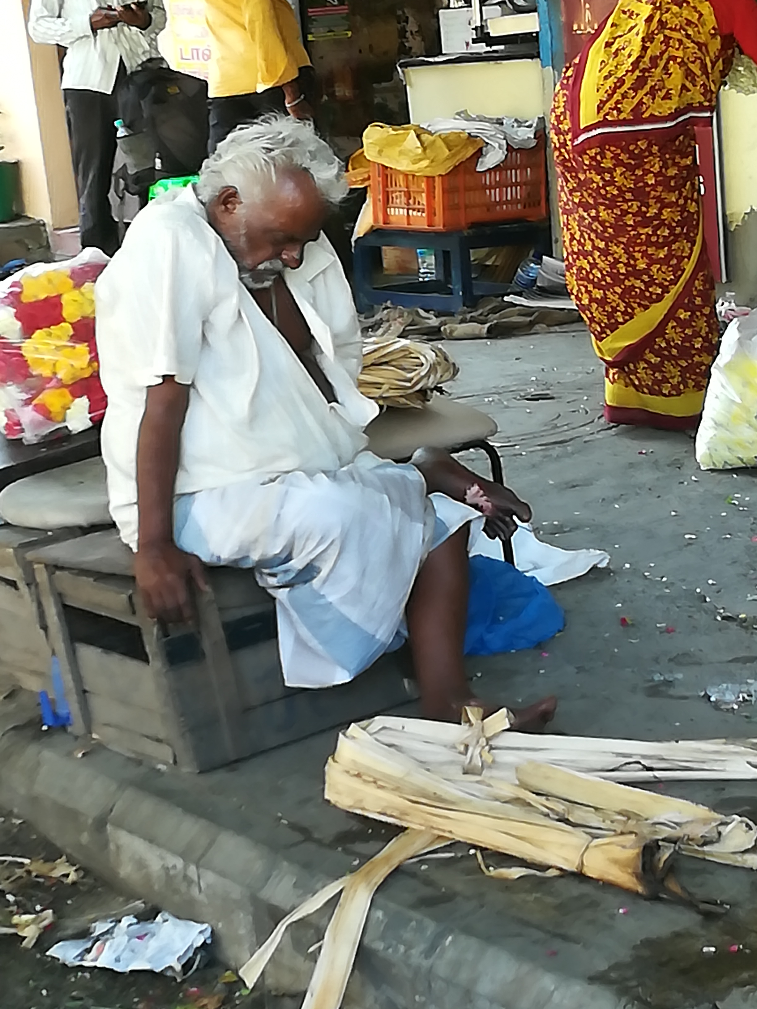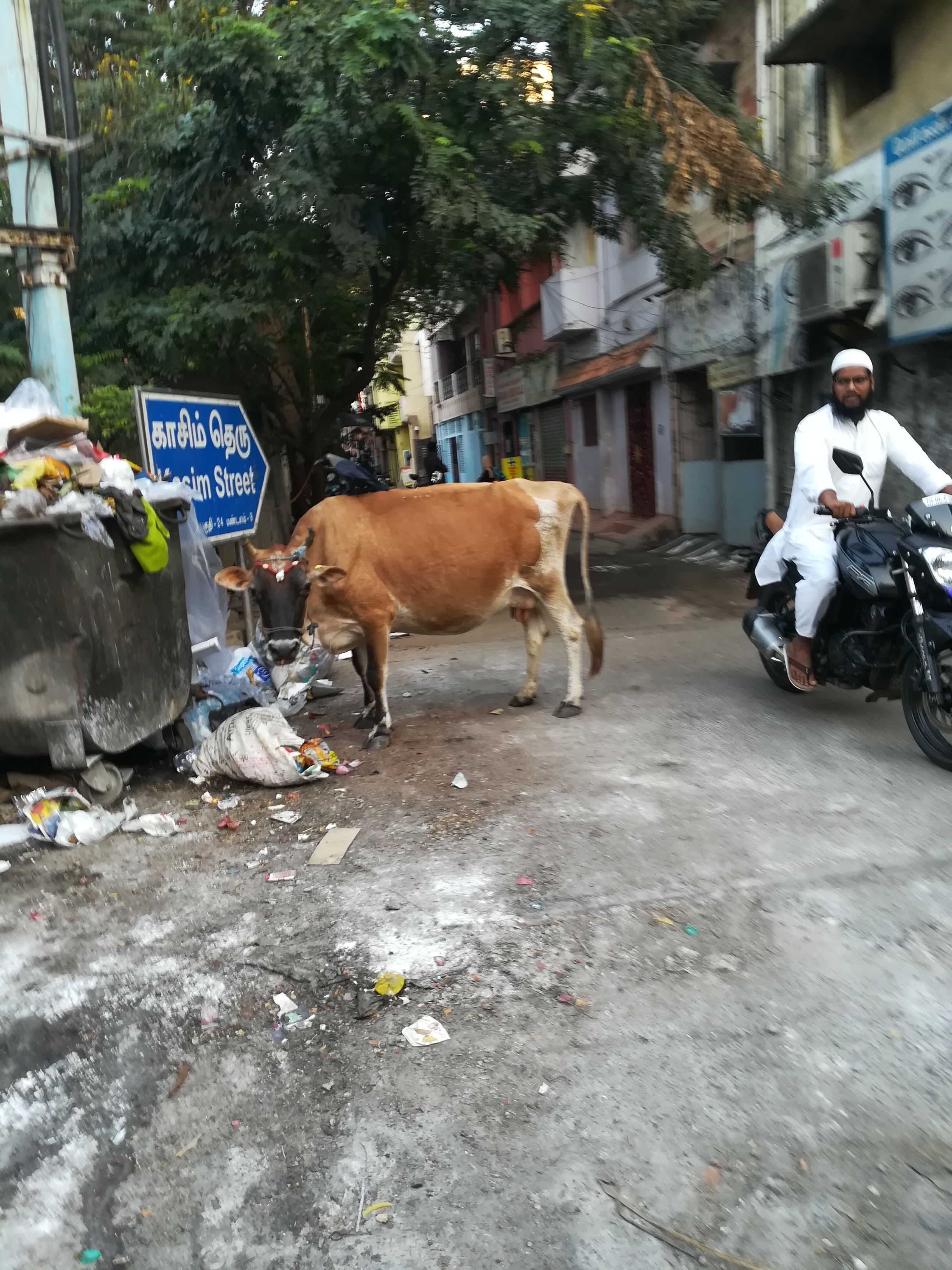 La pagaille partout, à Madras la circulation est d'une insensée anarchie. Peu de trottoirs en bon état et lorsqu'ils le sont, les émanations d'urine te saisissent. Odeurs nauséabondes d'eaux putrides de-ci, de-là. Un homme défèque et pisse, debout, là sur la chaussée. J'enjambe un être allongé, le sourire édenté. Ça n'arrête pas de klaxonner, le bruit est infernal. Je marche plutôt sur les bords poussiéreux de la chaussée, les véhicules me frôlent mais ne me touchent pas, ils me respectent tout comme ils respectent … les vaches sacrées. Je fais partie du flot circulatoire. J'ai ainsi acquis la technique pour traverser : surtout ne pas attendre qu'on stoppe pour te laisser passer, tu te lances dans le flot de véhicules et ils zigzaguent pour t'éviter. Je fais les trois kilomètres qui me séparent de la plage dans ce chaos si difficile à décrire tellement il est irréel. L'Inde, c'est ça : chacun pour soi, ne t'occupes pas de l'autre. Regarde bien où tu mets le pied, surtout ne trébuche pas, personne ne viendra t'aider.