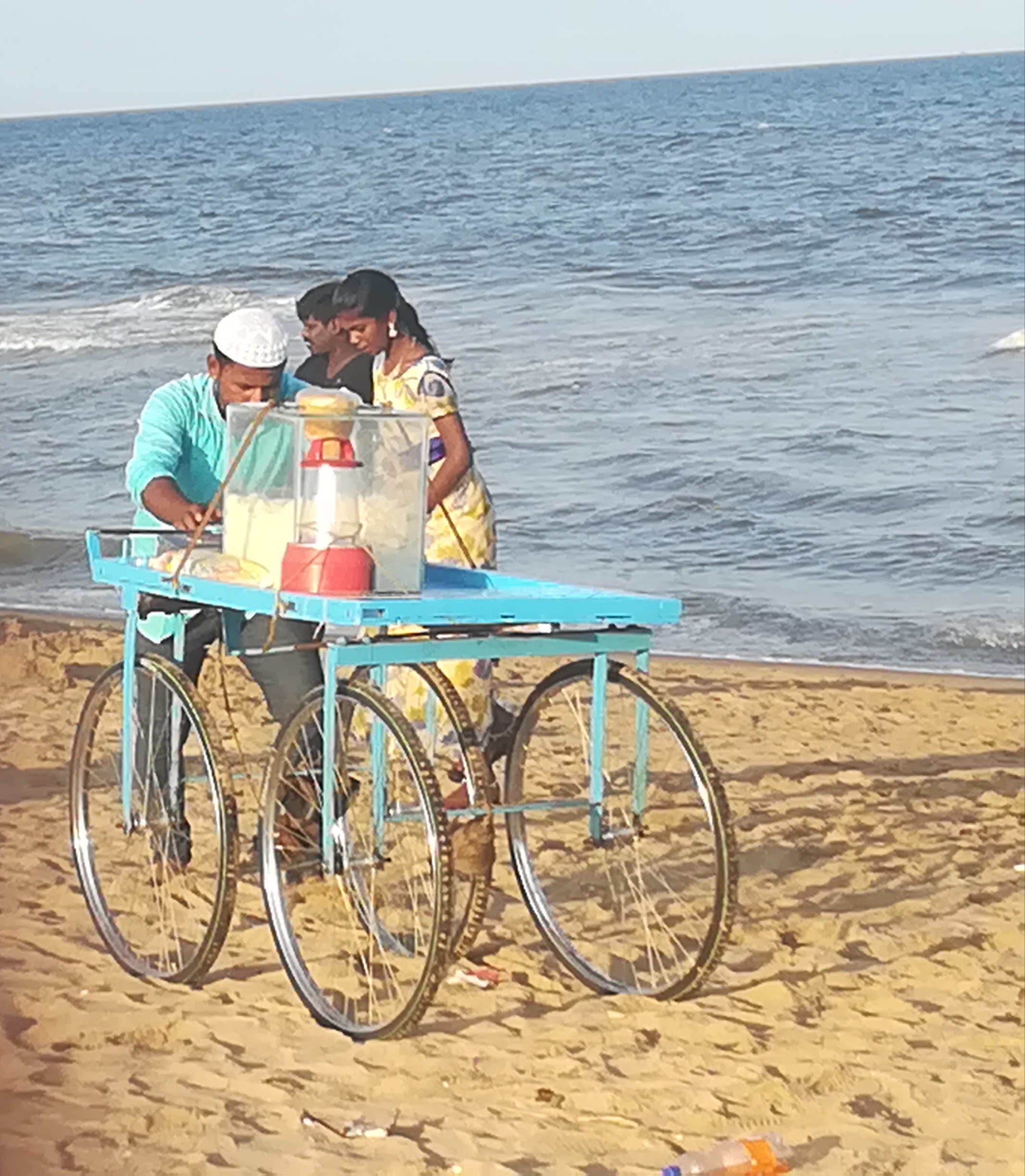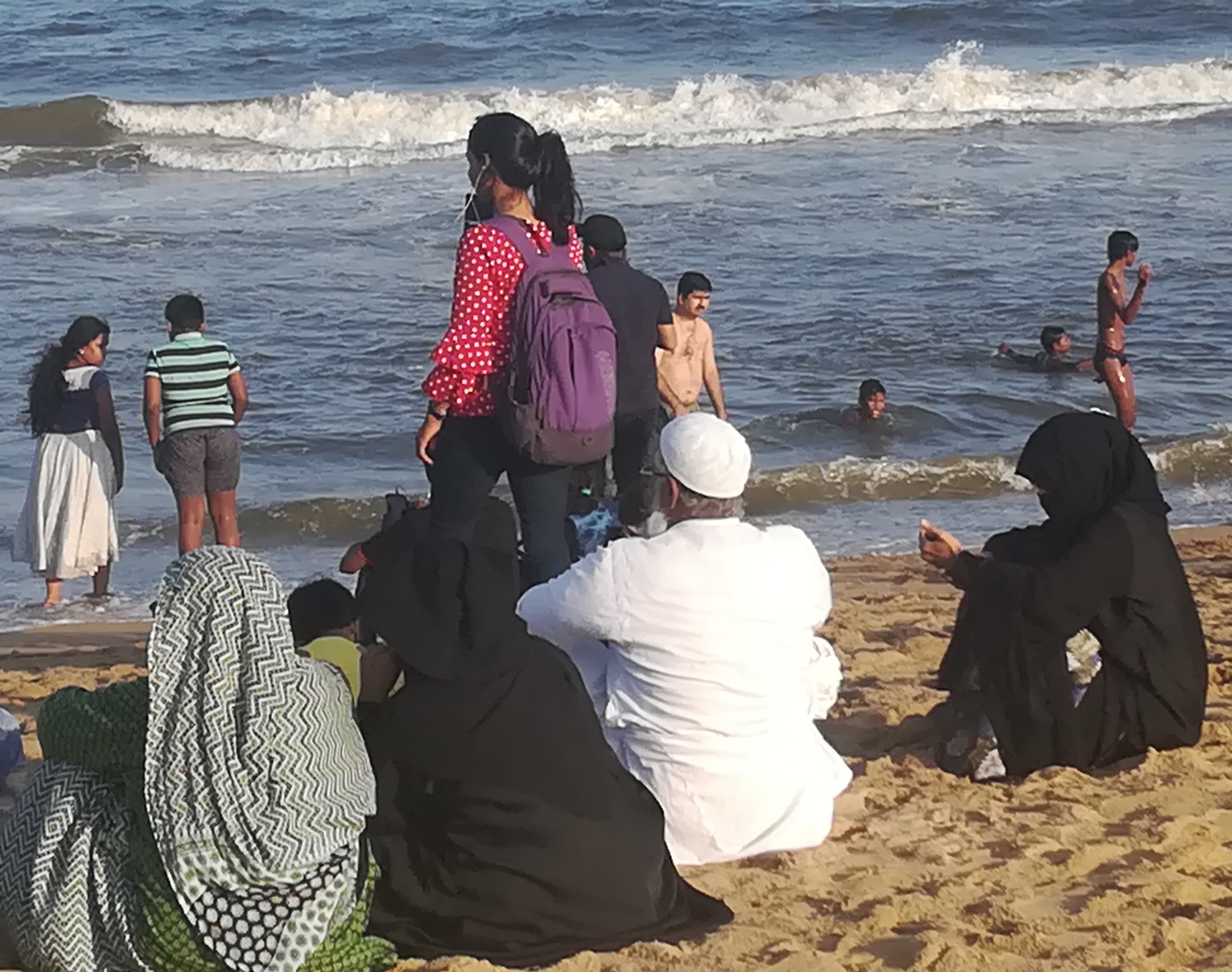 La plage urbaine de Marina Beach est l'une des plus longues du monde (13 kilomètres) mais rien à voir avec la belle carioca qu'est Copacabana. Pas de fesses rebondies délimitées par un string à peine discernable. Les tenues ici sont celles de la ville, on garde ses chaussures, pour avancer dans le sable pollué, et ses vêtements pour se baigner dans les rouleaux de l'Océan Indien. Cette plage est une immense arène de jeux et de farniente où l'on vient le dimanche en famille.