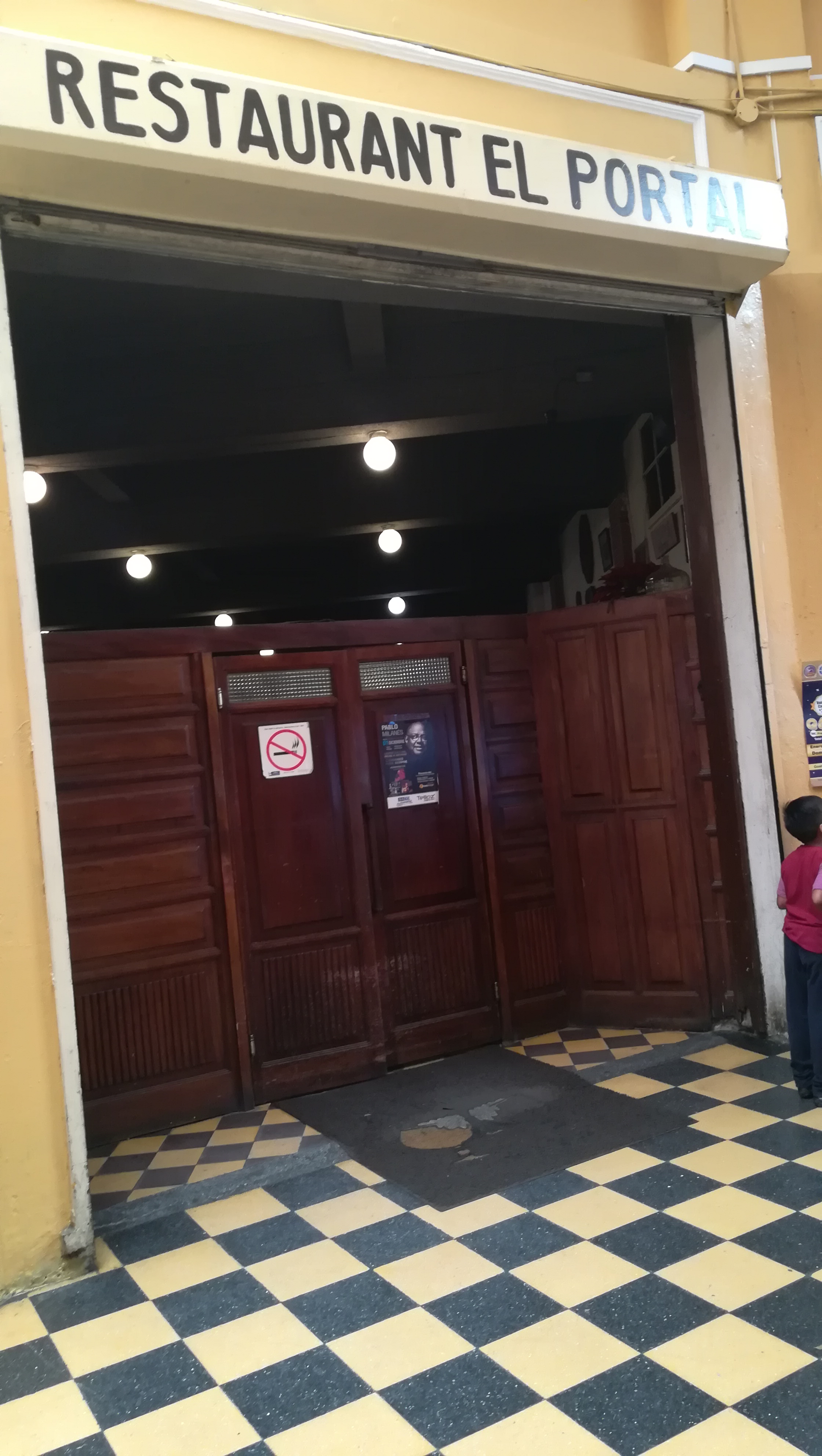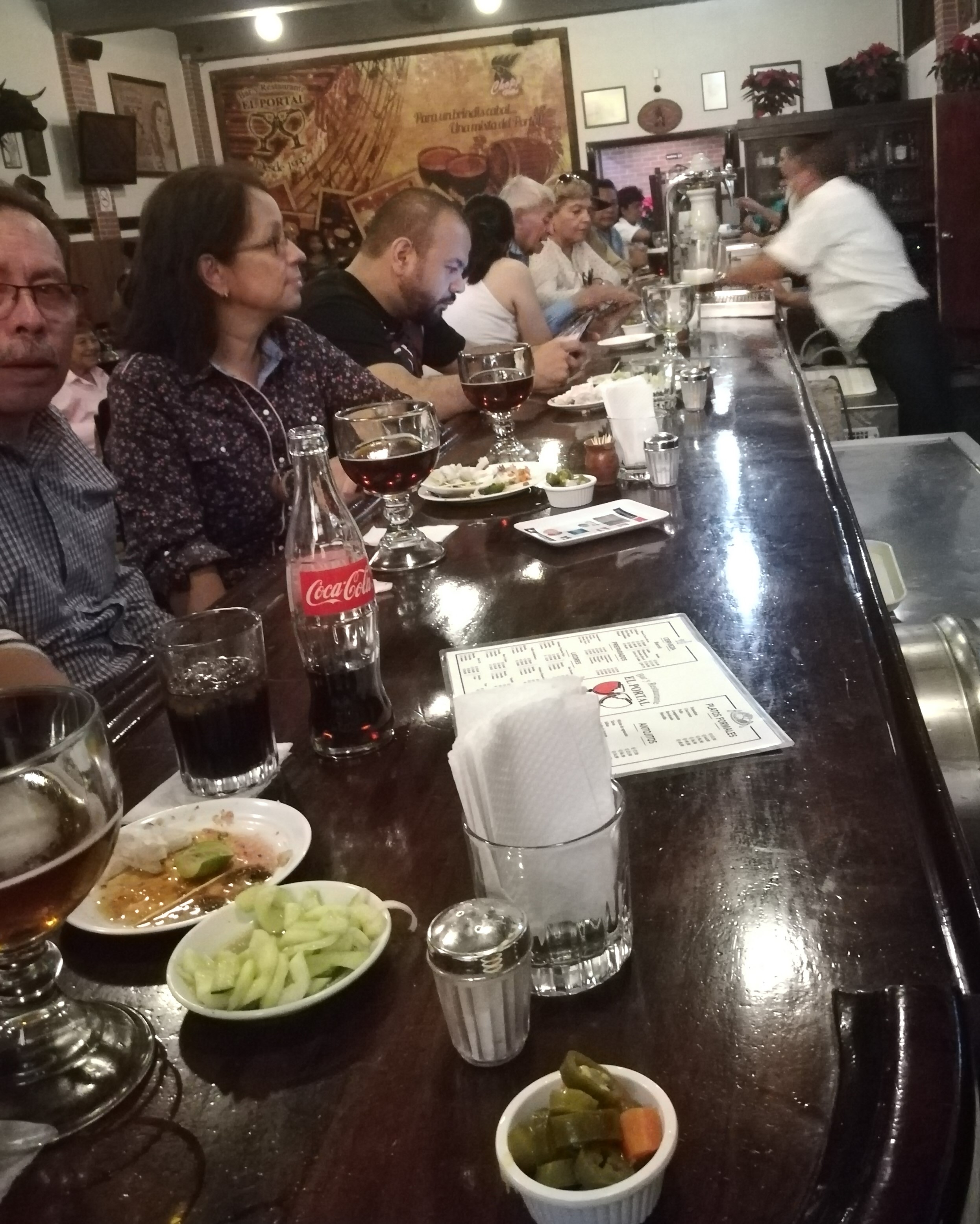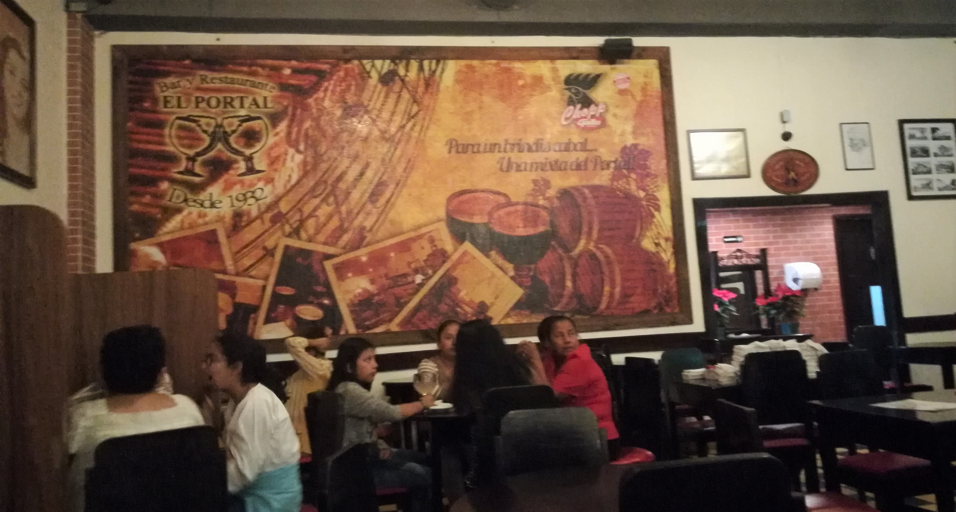 Le « portalito », désignation actuelle du café-restaurant, se situe dans le passage Rubio, une galerie emplie de boutiques d’orfèvrerie. Il fut inauguré en 1932 et reste, depuis, un lieu de rencontre très apprécié. On y entre par une double porte battante. A droite, un long bar, à gauche, un orchestre en étage avec la marimba qui accompagne les convives. Un mobilier d’origine, obscur ; un plafond haut avec peu d’éclairage assombrit davantage l’endroit. Quasi toutes les tables sont occupées et l’ambiance est chaleureuse ; un couple danse juste à côté de la table que l’on me propose. Je commande deux antojitos, c'est la spécialité maison ! le premier avec saucisse, guacamole et oignon doux sur galette de maïs ; le second comprend diverses micros galettes de maïs, surmontées de je ne sais quoi, peu importe, ça emporte la bouche ! Les plats sont petits mais la bière Gallo est grande. J’imagine le Che dans une telle atmosphère, des photos noir et blanc aident au souvenir… mais là, je ne suis pas vraiment entouré de poètes. Deux grosses nanas viennent s’installer à la table voisine et veulent prendre des photos avec le beau jeune homme repu d'antojitos. Rapidement, je fuis ces rondeurs felliniennes si envahissantes et si peu affriolantes !