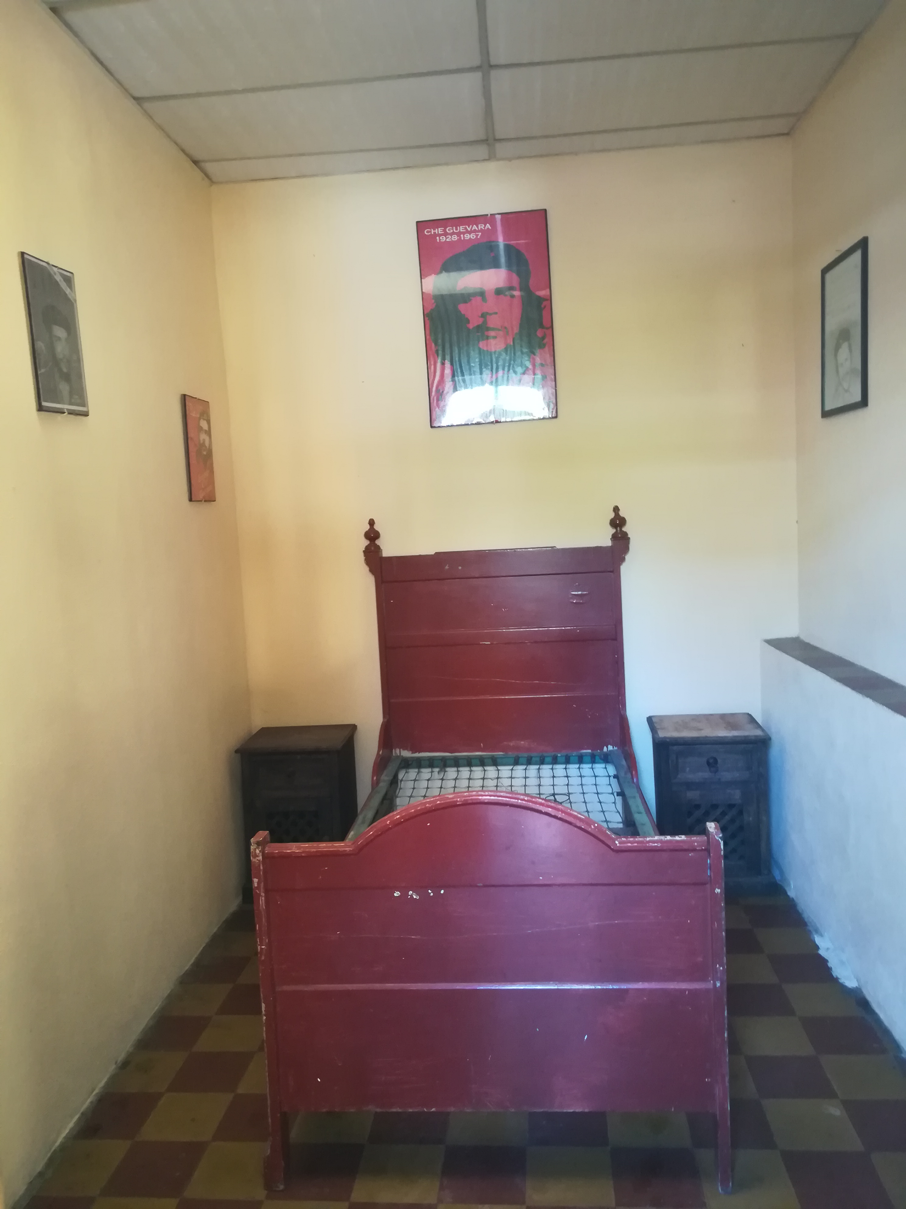 Je remonte deux rues et traverse, à gauche, vers l’hôtel Meza. Les hôtels du centre historique ont de grosses portes métalliques verrouillées en permanence. Je profite de l’entrée de clients pour pénétrer dans cet hôtel vieillot. Je sais par internet que la chambre 21 était celle du Che. Si le patio principal est verdoyant et agréable, les individus que je croise ont des mines patibulaires. Lorsque je croise le gardien des lieux, dans les dédales de ce « palace pour les sans-le-sou », je lui demande : « Puis-je entrer dans la chambre du Che ? », « De qui ? » me répond-il… « de Ernesto Guevara ! », « C’est qui ? … », « celui qui occupait, il y a quelques temps déjà, la chambre 21 », « Attendez, venez avec moi ». Et le voilà qui prend un téléphone de l’époque du Che et appelle, je ne sais qui… Oui, vous pouvez y aller ! Gracias hombre ! La porte était entrouverte. La chambre 21 est un petit musée dédié au Che, où le plus gros meuble, est un lit étroit sans son matelas. Un petit quart d’heure d’émotion et de recueillement !