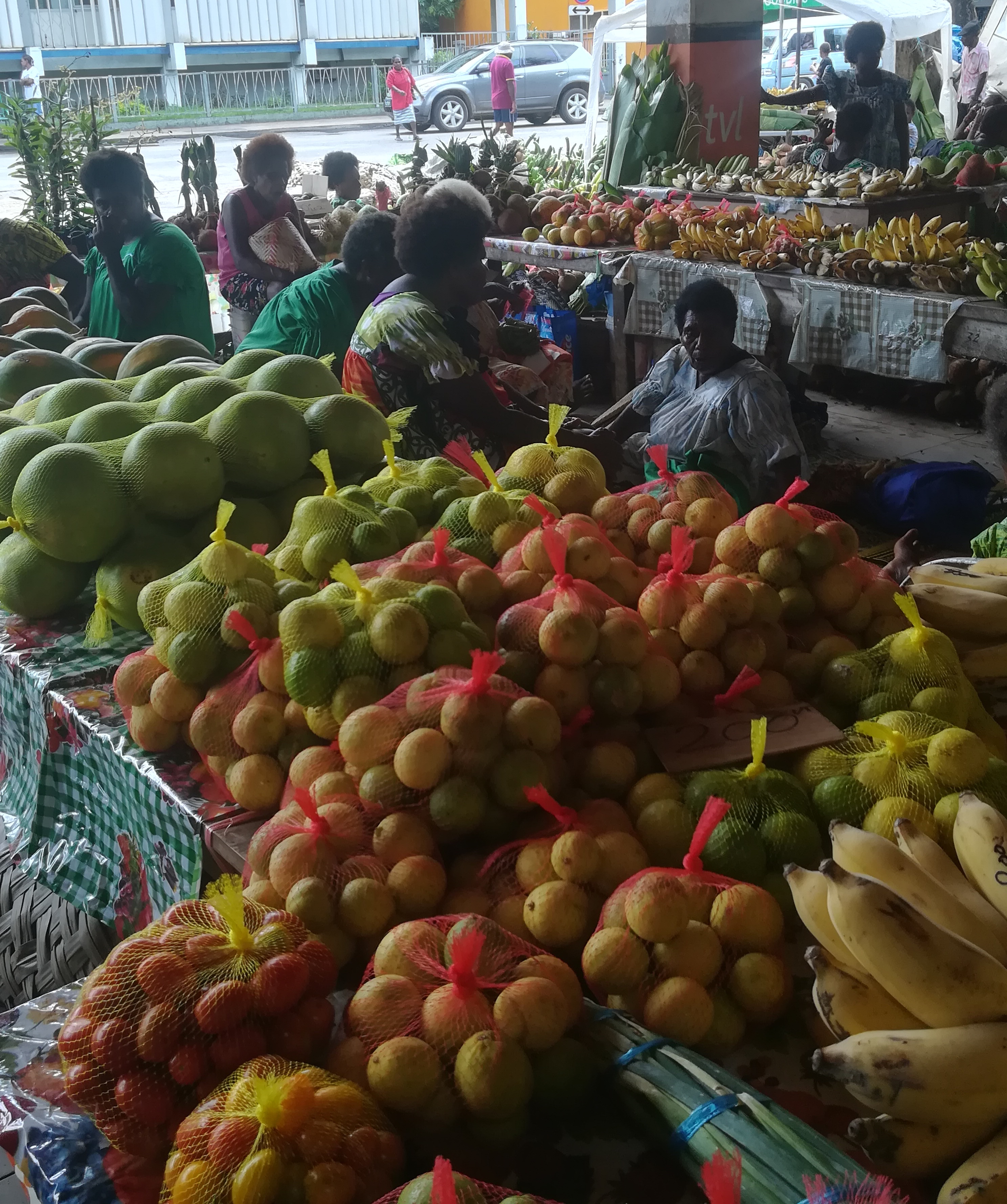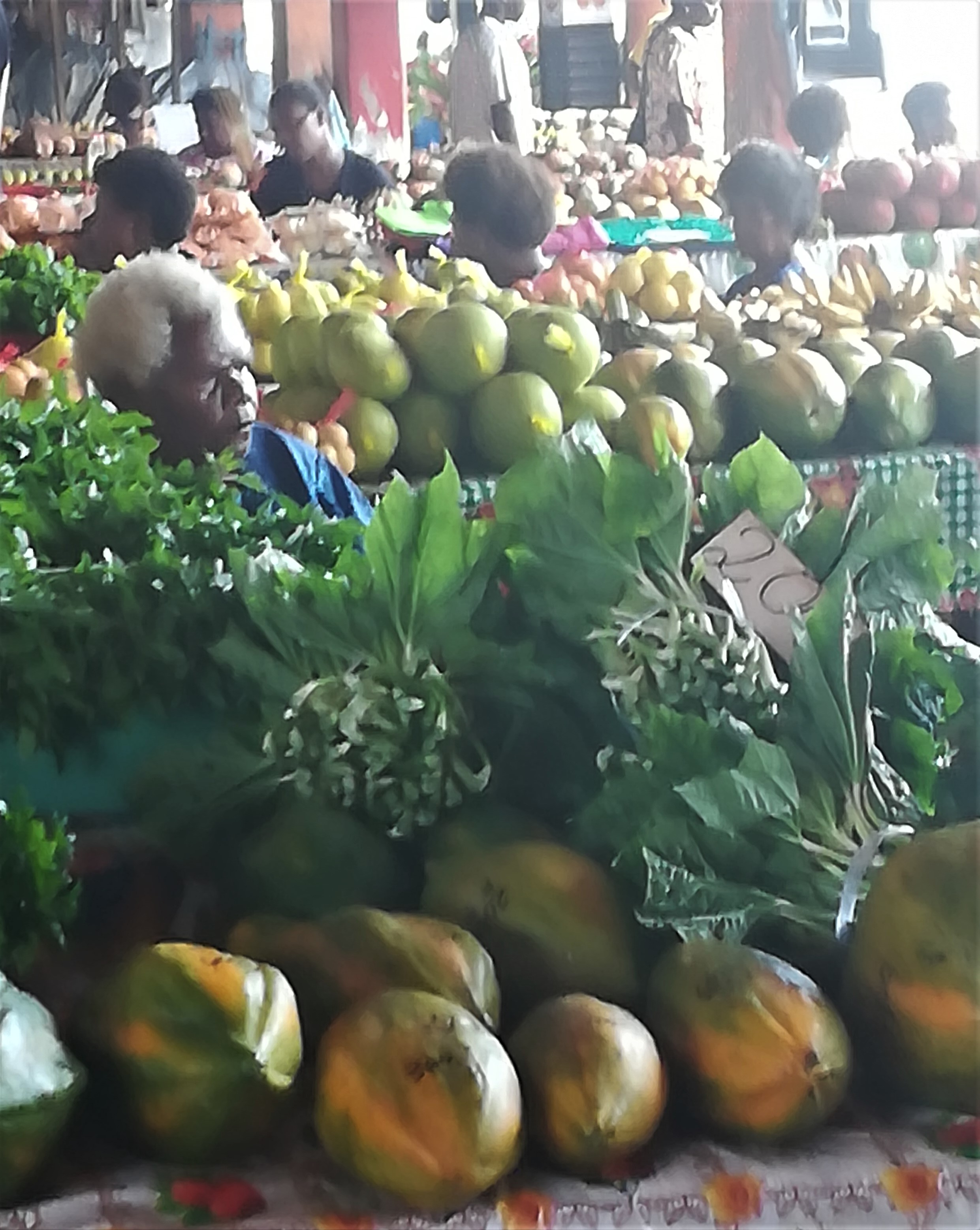 Bien évidemment, je commence mon séjour par le marché, c’est là où tu sens battre le mieux le pouls du pays où tu débarques. J’ai beaucoup aimé sa pagaille haute en couleur de celui de Port-Vila. Les étals sont organisés en rectangles à l’intérieur desquels s’amassent systématiquement famille et amis. Et cela se répète un peu partout pour les fruits et légumes. Les allées sont également utilisées pour stocker la marchandise : des lots de noix de cocos, de patates douces, de manioc, sont posés à même le sol avec un bout de carton ou de contreplaqué indiquant le prix ; ça rend difficile la circulation des acheteurs mais tout le monde enjambe et s’en accommode.