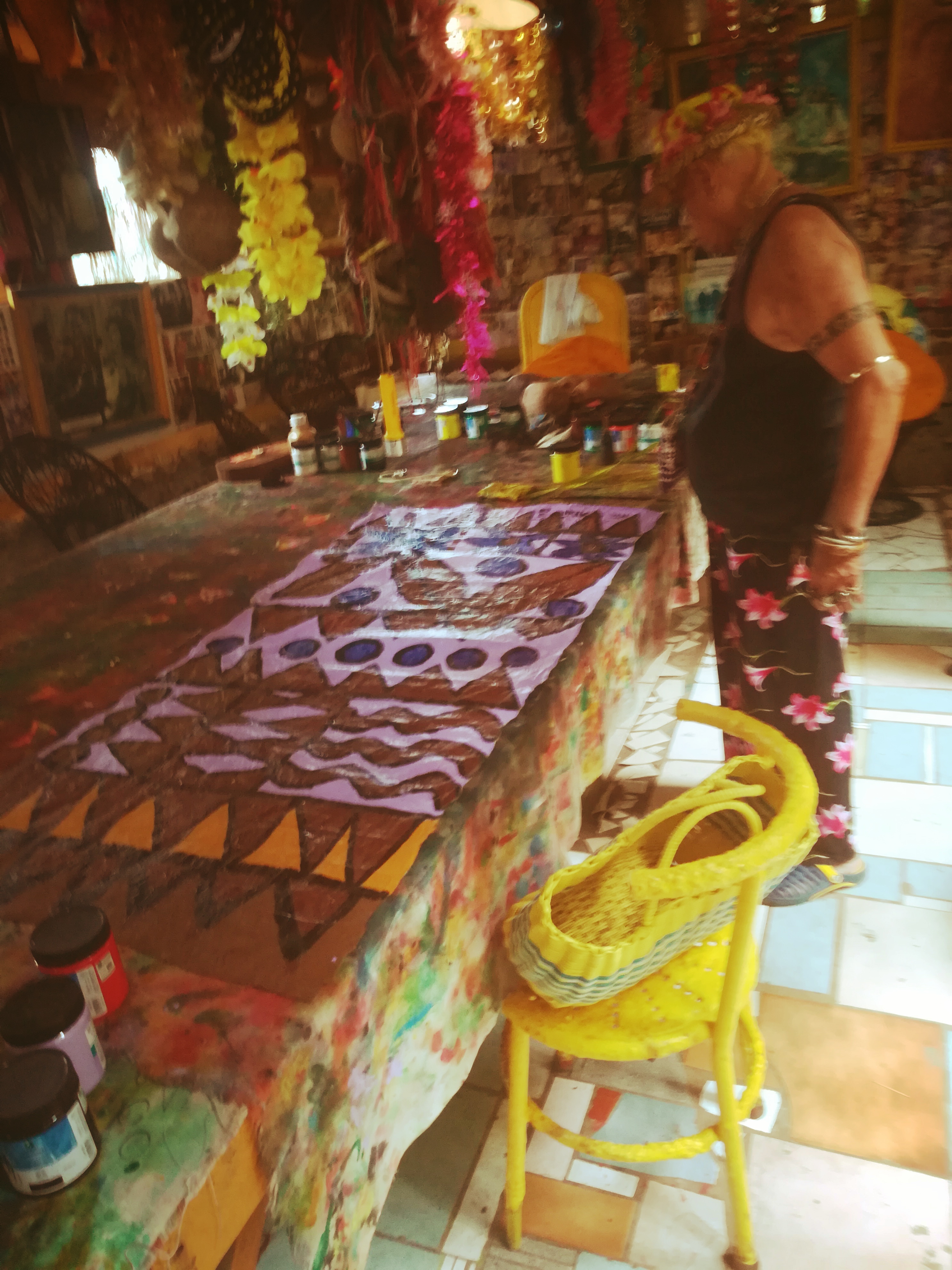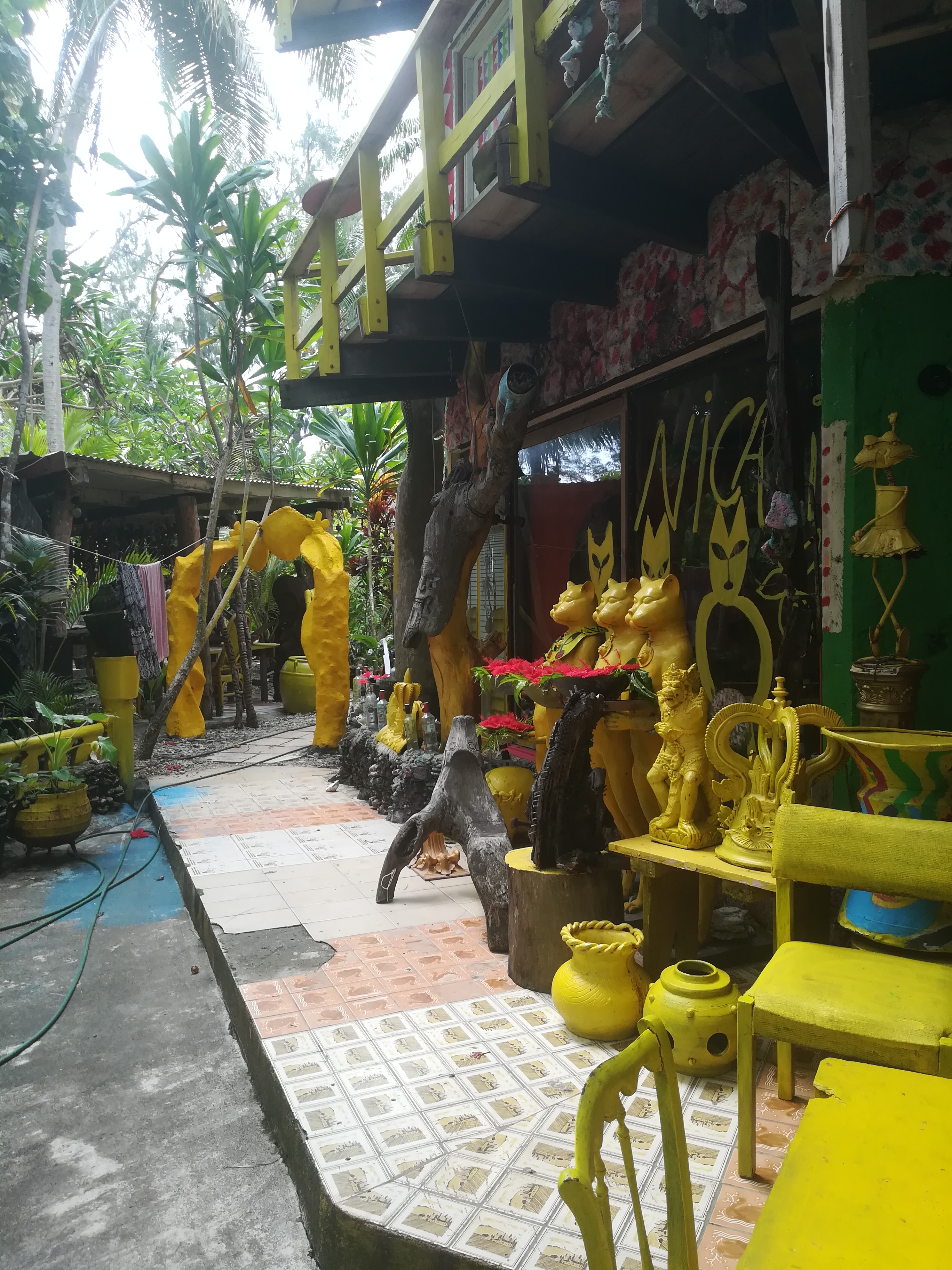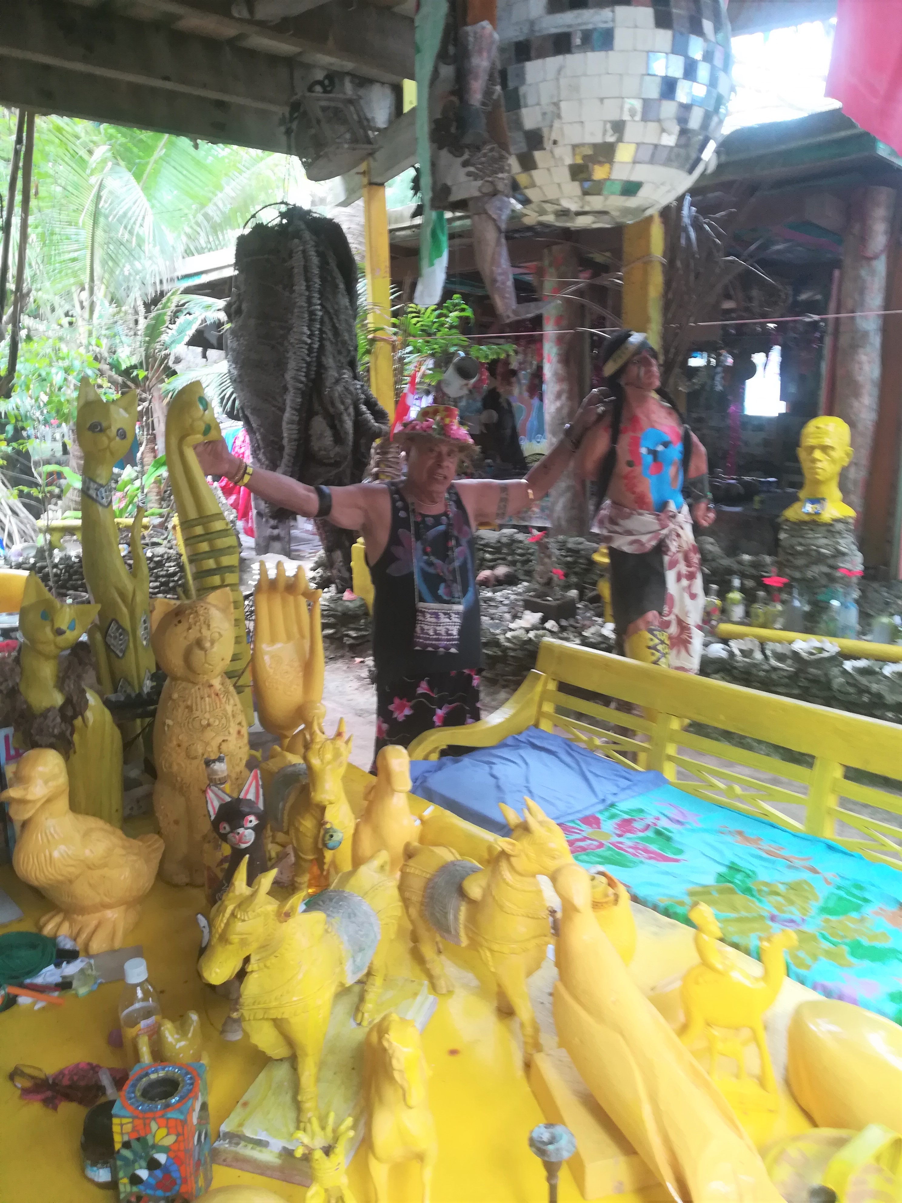 Lorsqu’on s’enfonce dans la végétation dense qui entoure son lieu de vie, on est déconcerté par l’état de délabrement et d’abandon. Les couleurs surgissent derrière un bosquet et une voix m’interpelle : « vous êtes français ! ». Je n’avais pas aperçu notre artiste dans ce capharnaüm de nature et de bric à broc, plus trivialement, dans ce bordel. Il m’invite à visiter sa demeure, son atelier : tout est à mille lieux de l’ordre occidental, tu perds tes repères dans un tel désordre. « Si l'ordre est le plaisir de la raison, le désordre est le délice de l'imagination », appréciation de Paul Claudel. Cet Aloï, qui vit pour son art et la mémoire de Nicolas, loin des nuisances sociétales, est un bien curieux personnage… comme tout artiste me diras-tu !