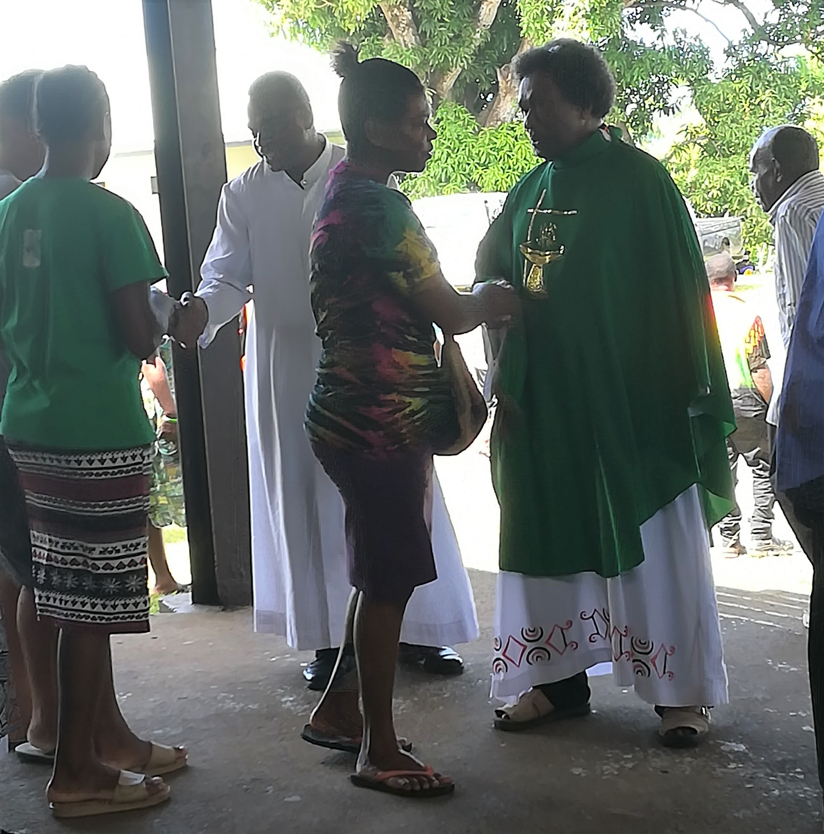 En ce dimanche, le mécréant que je suis va à la messe, non pas qu’il se soit converti mais en simple curieux dans un pays touché par une foi immense. J’assiste à un superbe spectacle et suis pris par la fraternité qui se dégage tant à l’intérieur du temple qu’à l’extérieur. Plusieurs dames et hommes sont venus me serrer la main pendant l’office et je n’ai pas compris pourquoi. Il est vrai que la messe est dite en utilisant les trois langues du pays : le bichlamar, le français et l’anglais… et je loupe quelques passages. Les séquences chantées sont fort prenantes. Les dames se sont parées de leur plus beaux atours. L’église est trop petite : des hommes d’un côté et des dames-enfants de l’autre suivent la messe depuis l’extérieur et rentrent momentanément, pour communier ou prier. C’est curieux !