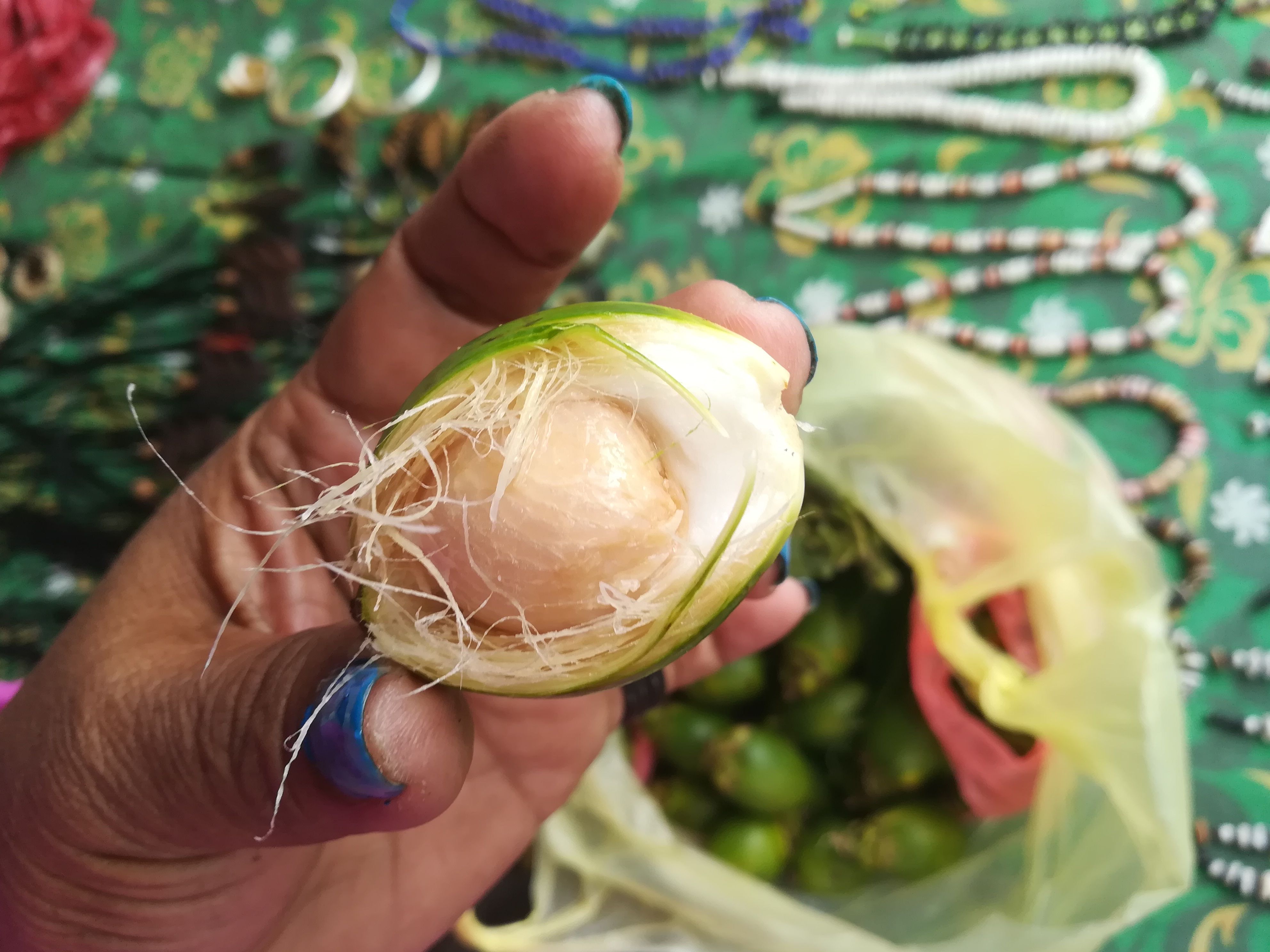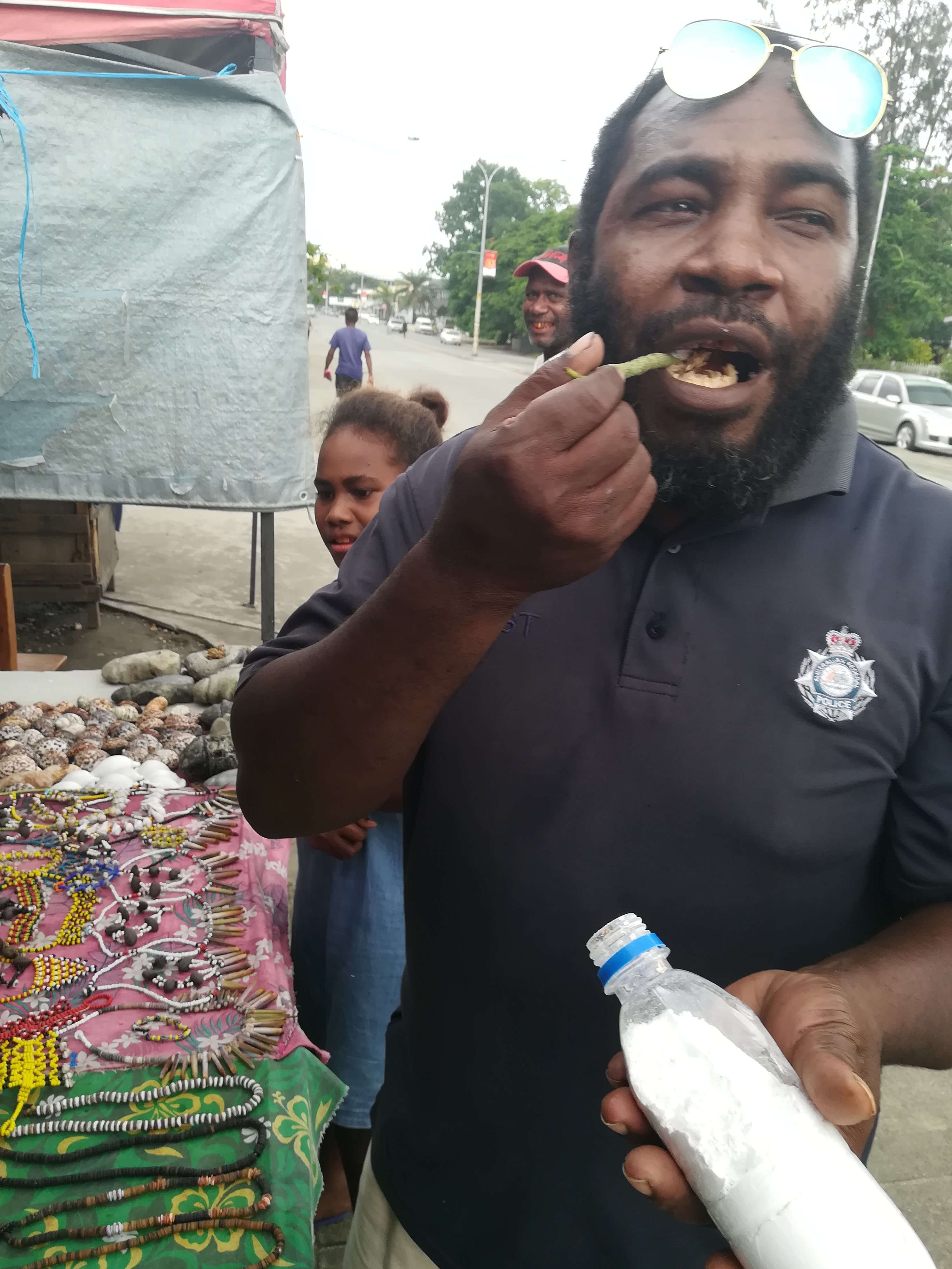 Je suis curieux et aime savoir, mais goûter, c’est autre chose. Alors Alan me fait la démonstration. Il décortique le fruit pour extraire le noyau qu’il va mâcher, il rajoute une feuille de bétel et enrobe de poudre de chaux blanche (le « Lime » disent-ils). Il « enfourne » l’ensemble et mastique générant ainsi une chique qui colore la salive et les dents en rouge. Une vingtaine de minutes après il la recrache… d’où les bas-côtés de route tachés de rouge…
