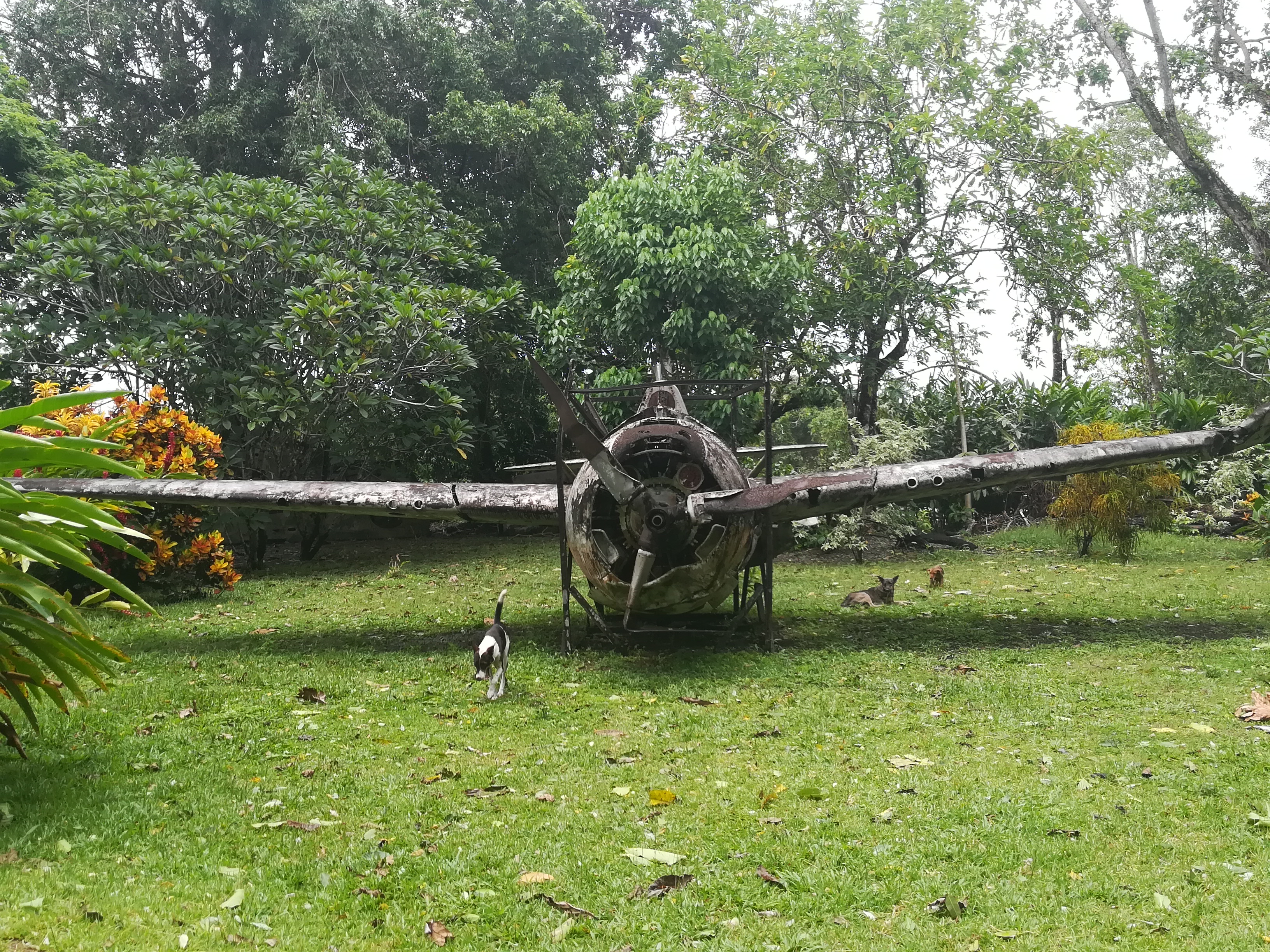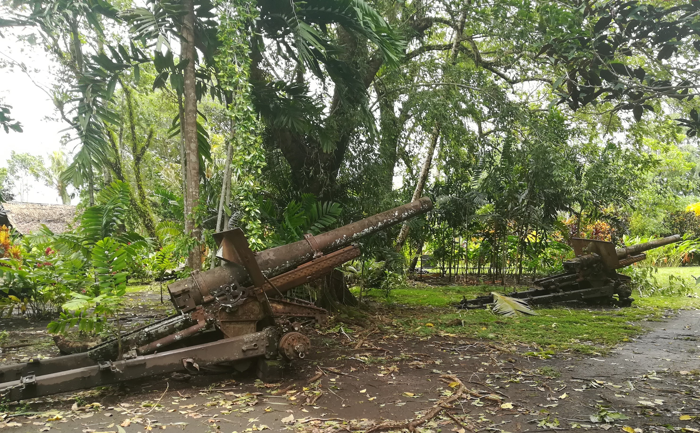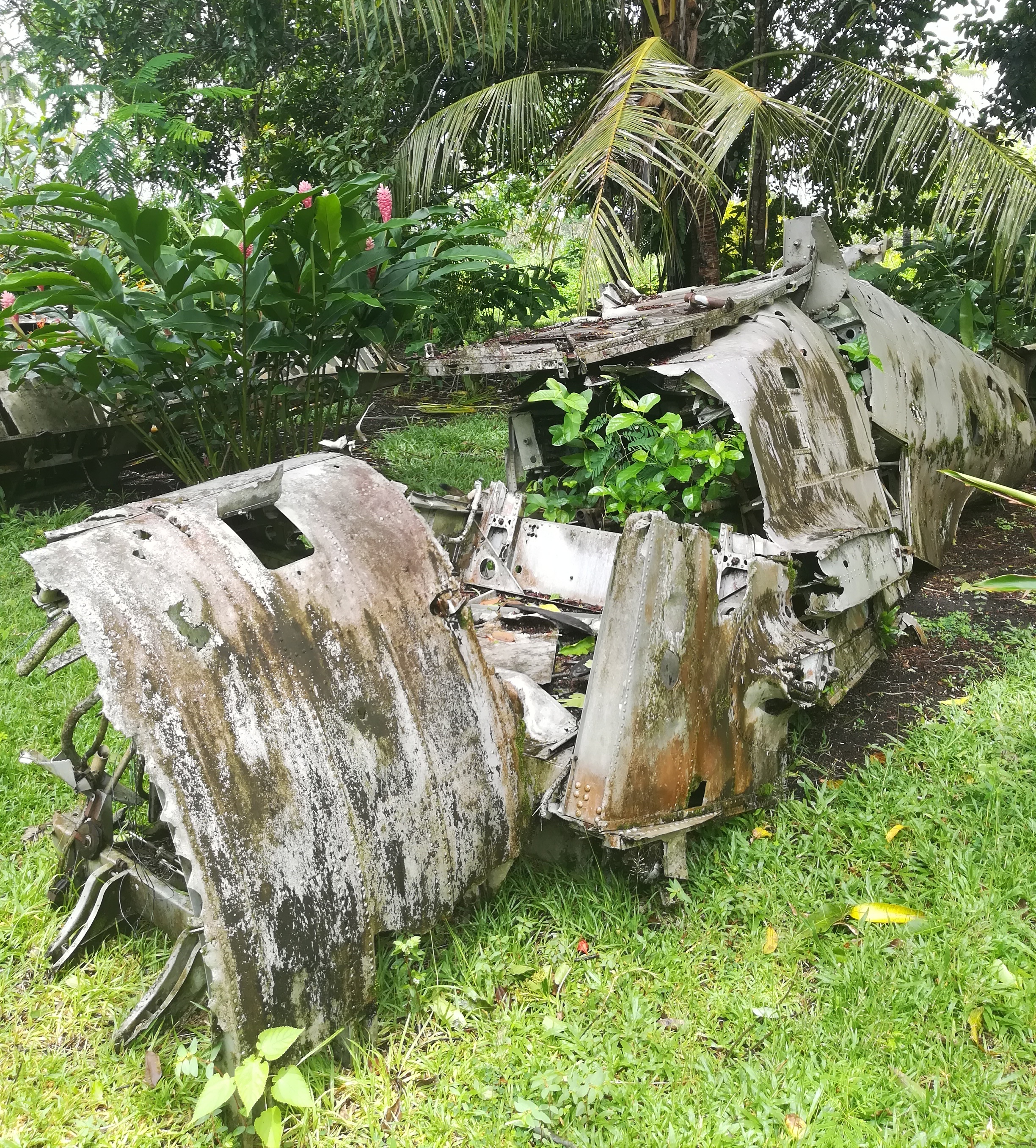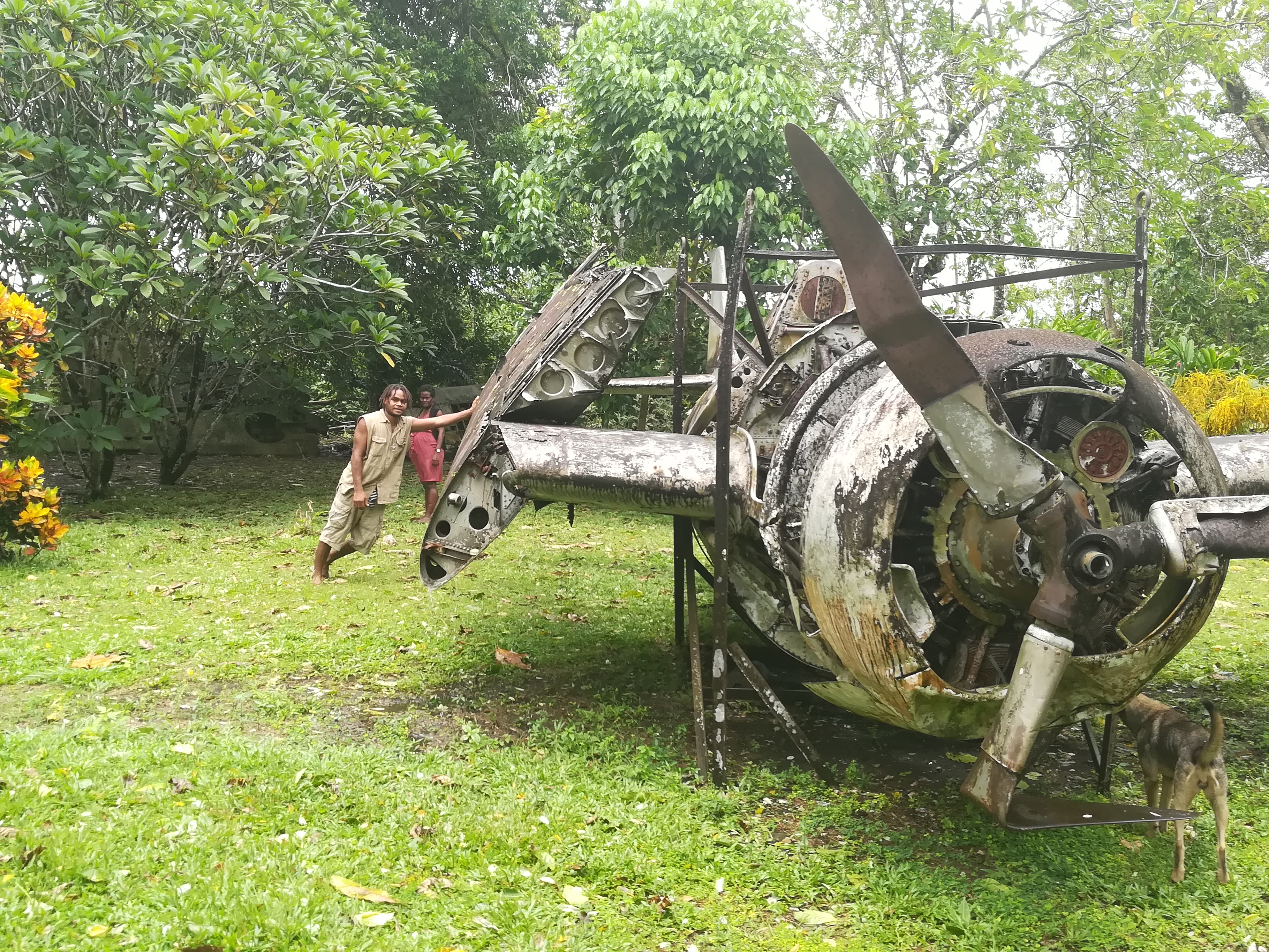 J’ai voulu aller voir les « Utah Beach » et « Omaha Beach » de Guadalcanal : Ndoma Beach, Mbonege Beach, Red Beach… Elles sont aujourd’hui des lieux paisibles où les Honiarais se rendent les week-ends pour le traditionnel barbecue de poisson, la seule guerre qui vaille le coup, celle de la convivialité. Juste après la bataille de Guadalcanal, un habitant de ces plages, Fred Kona, a profité du crash d’un avion sur ses terres, pour démarrer un musée de la guerre. Il a amoncelé des tas de débris : bouts d’ailes, moteurs, armes, DCA, mâts… pour créer un cimetière au milieu des fleurs et des vols erratiques de papillons magnifiques. Son petit-fils, Thomas, assume totalement l’héritage du grand-père en conduisant les visiteurs du Vilu War Museum. Il m’accompagne dans ce fatras de débris en m’expliquant l’origine de chaque bout de ferraille, fragment d’arme ou carcasse guerrière.