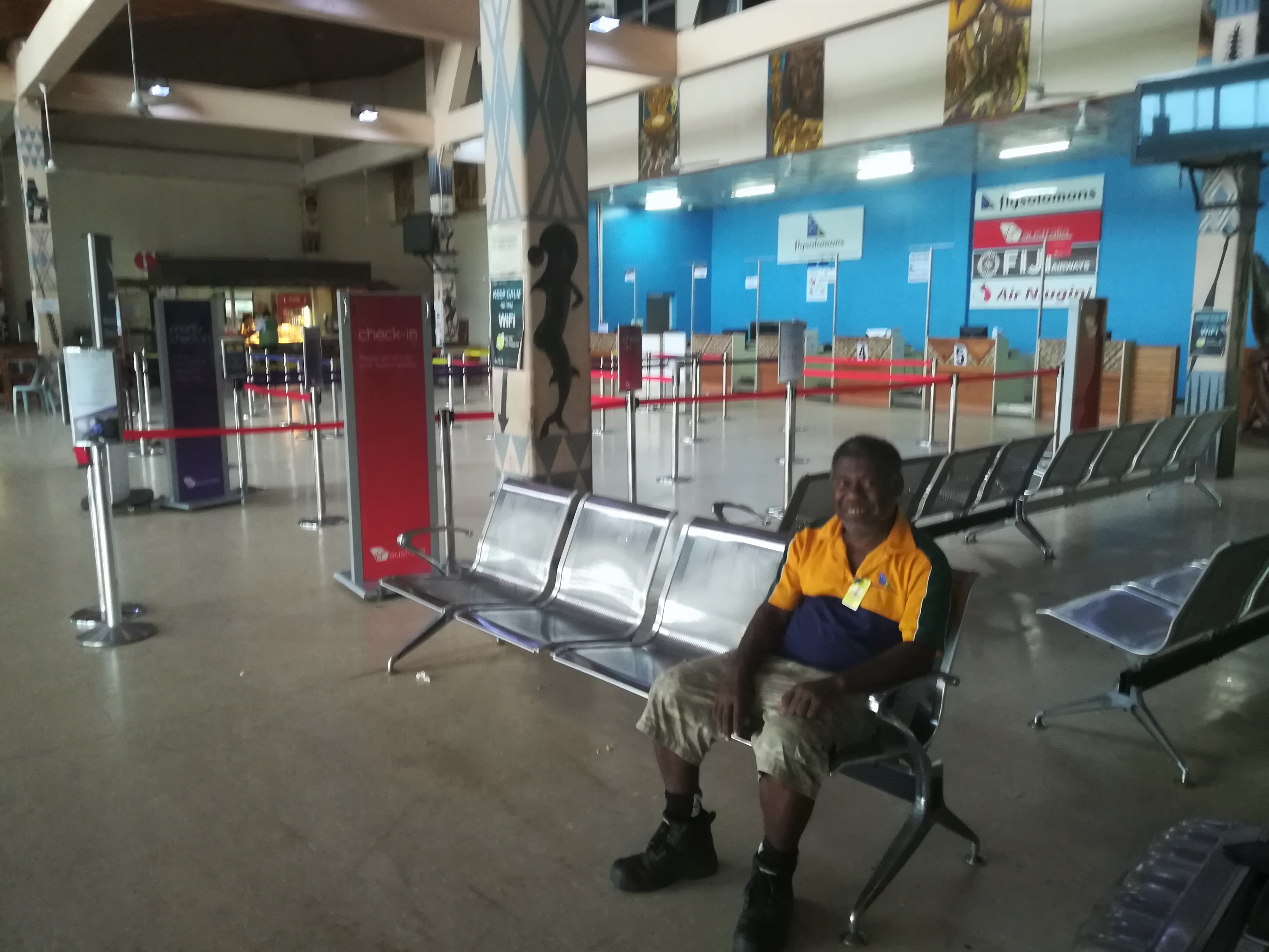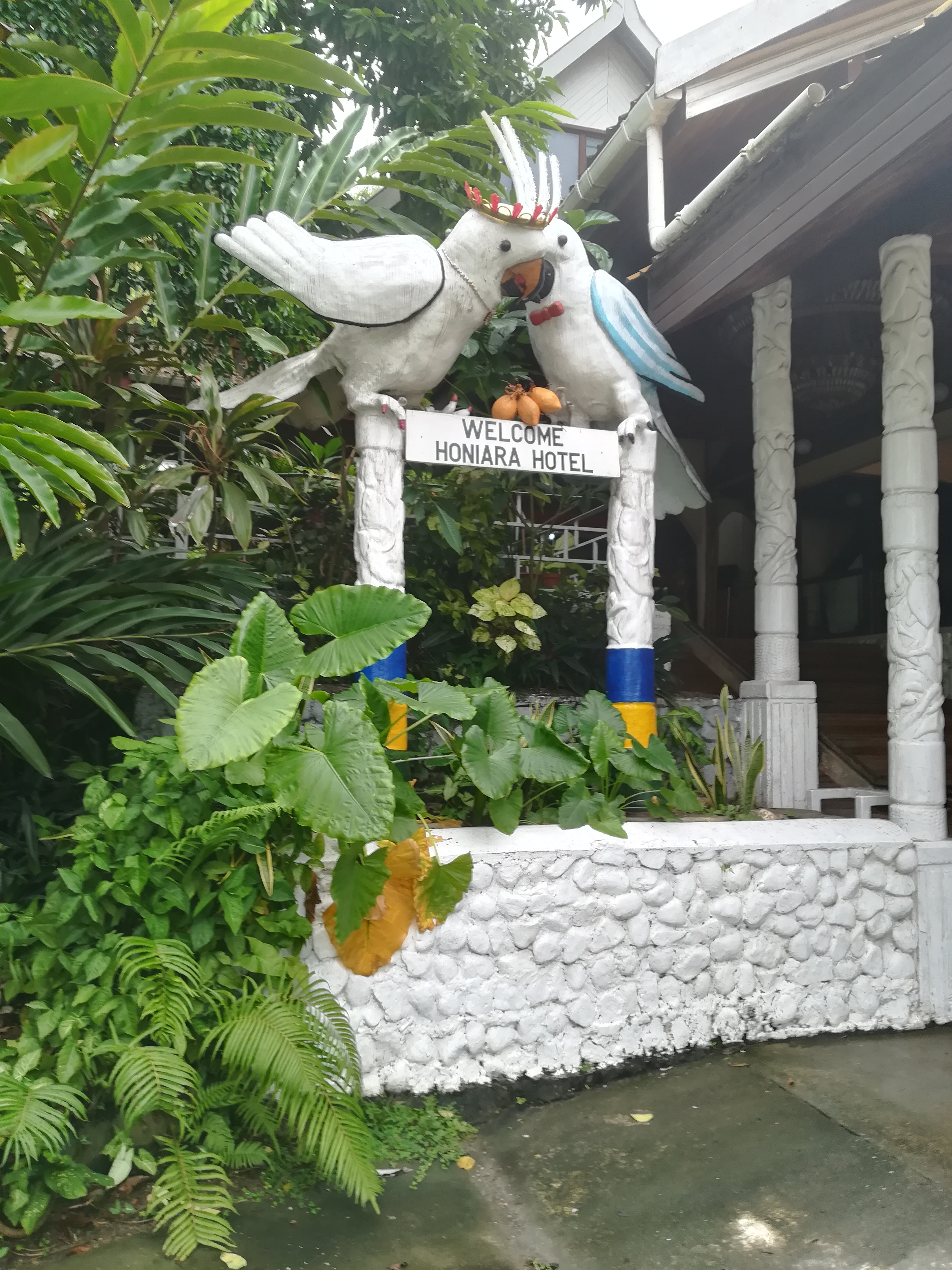 J’arrive à Honiara, la capitale, oublié par mon hôtelier dans cet aéroport modeste et vieillot, privé de téléphone, ma carte SIM n’est pas reconnue ici, Gordon le seul employé permanent de l’aérogare, vient à mon secours. Il occupe un bureau miteux mais c’est un salomonais en or, sa sympathie raccourcit le temps d’attente de la navette. Les dix kilomètres de route qui conduisent à la ville collectionnent une multitude de « trous », résultat d’un macadam fragile, agressé par des pluies diluviennes : ces monstrueux nids de poule, à franchir quasi à l’arrêt, génèrent un incroyable ballet automobile et de gros embouteillages. Et voici mon hôtel vieillot, sur les pentes d’un coteau abrupt, au décor douteux aussi kitsch que délabré. Certes on y trouve trois restaurants et un salon de massage mais… 93 marches à gravir pour rejoindre ma chambre… avec mon barda de 29 kilos. Monsieur Yang, 76 ans, en est le propriétaire, il m’offre pour évacuer les problèmes d’accueil trois massages : ça va me détendre… La population a le teint très foncé ici et le blanc que je suis est très vite repéré. Même les femmes s’intéressent de près à ma couleur de peau !
