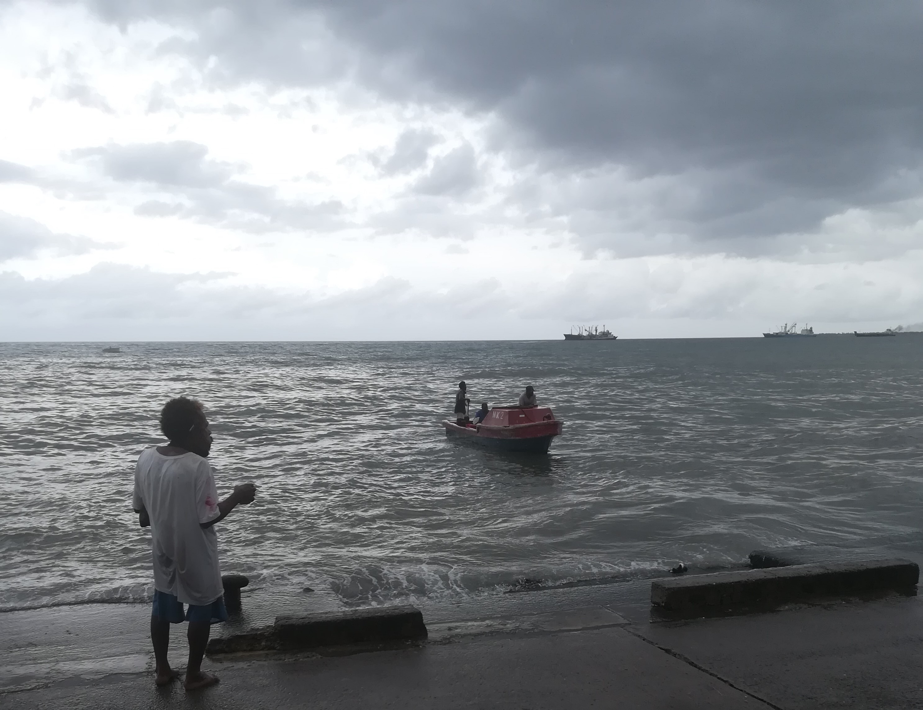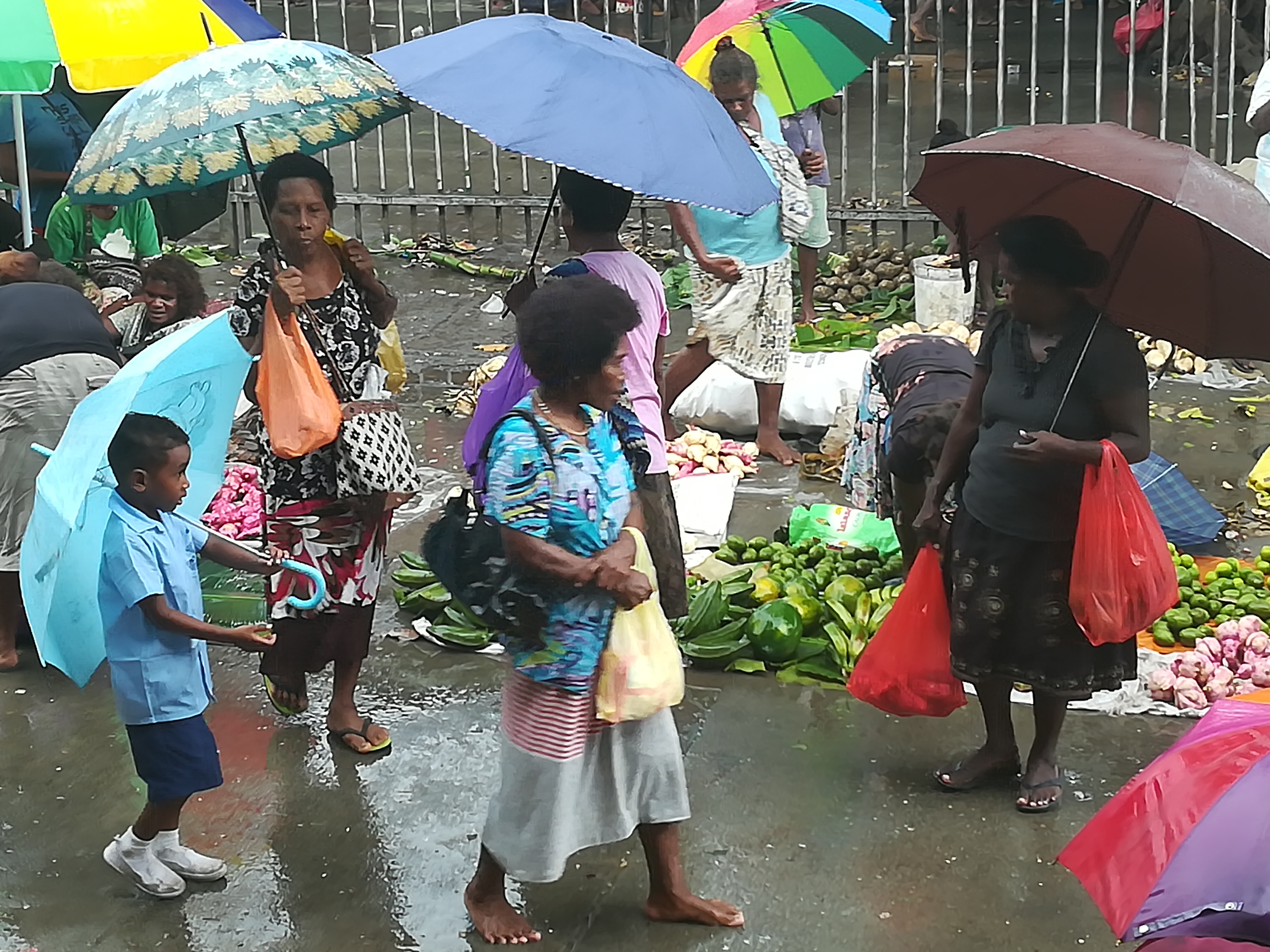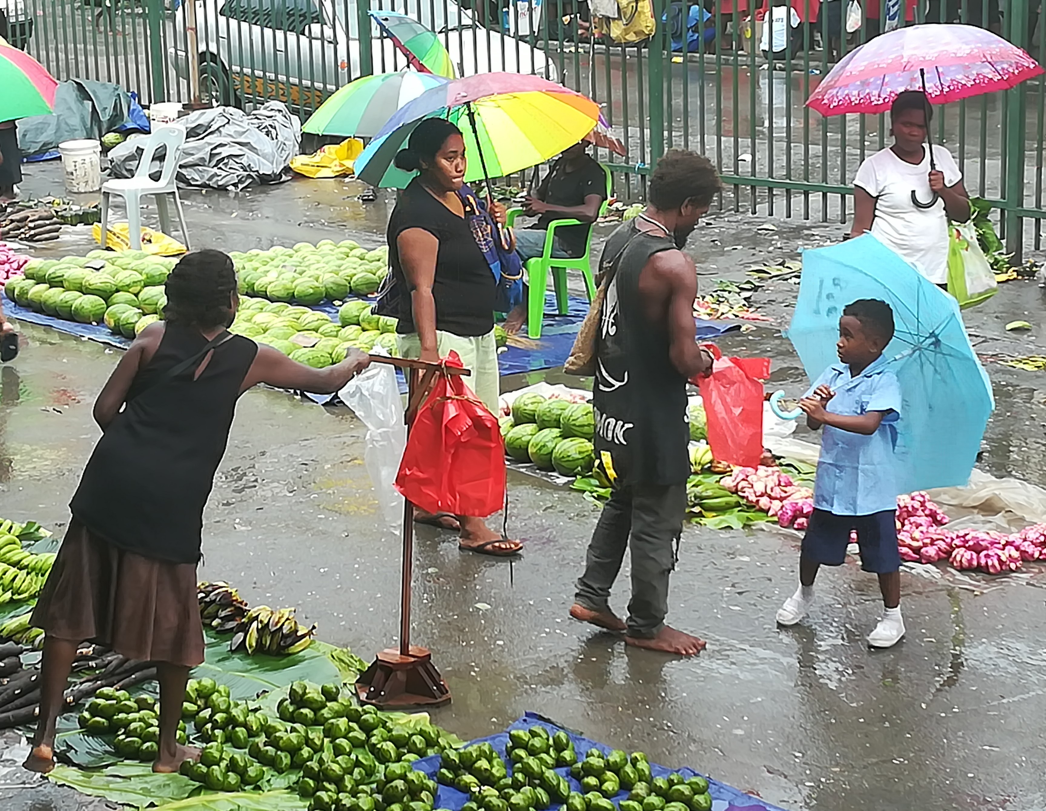 La pluie tombe sans répit et je peux difficilement m’organiser. Depuis ma chambre au bout de la 93ème marche, tantôt je vois, tantôt je ne vois plus le cargo là-bas dans la baie. Alors, comme les honiarais, je pars marcher sous la pluie… Je croise ainsi le peuple d’une autre manière, sous un parapluie pour les plus aisés, trempés jusqu’aux os pour les autres. Au marché central, on se protège comme on peut de la pluie. Je visite le musée sous la pluie, pas grand-chose à voir. Je m’abrite de temps à autre, certaines fois mon voisin curieux me demande mon nom, d’autres fois bonjour les odeurs. Et puis, je retrouve le grand sourire teinté de pourpre des masticateurs de Betelnut (noix d’arec), cette chique qui se consomme de l’Inde aux îles du Pacifique sud depuis 2000 ans. Les Salomonais sont, bien évidemment, addicts aux propriétés énergisantes du Betelnut ; ça me semble être le pendant de la feuille de coca des sud-américains.