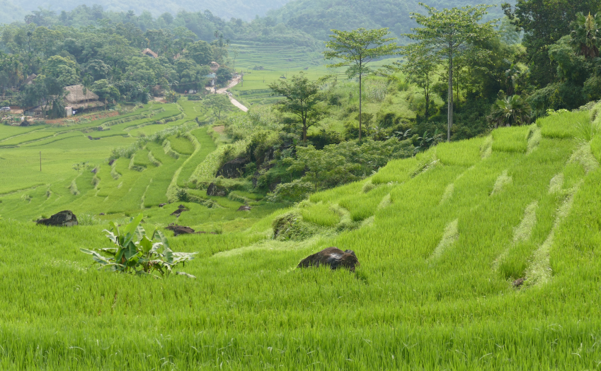Et une vallée avec un immense patchwork de rizières parsemé de nombreux hameaux et sillonnée d'une multitude de petits cours d'eau et de roues à aubes, idéal pour s'immerger dans la campagne vietnamienne.